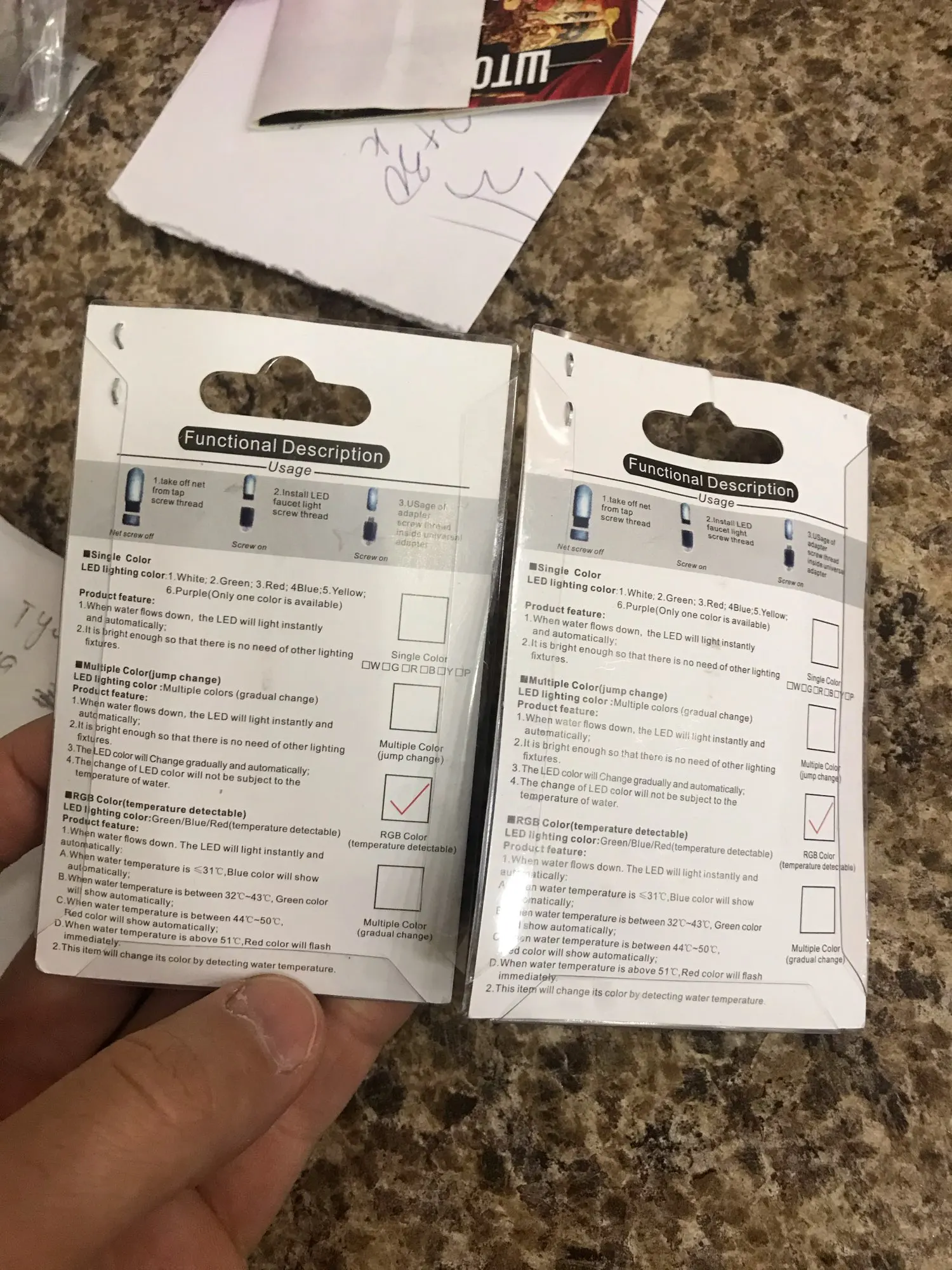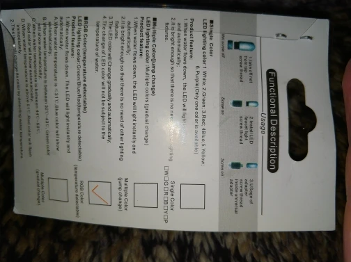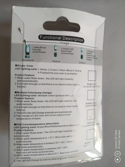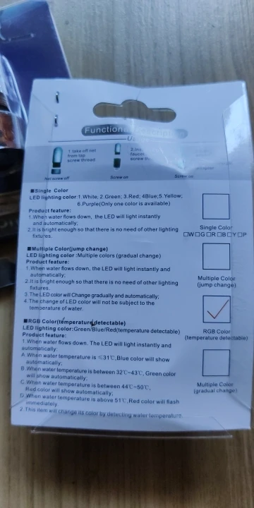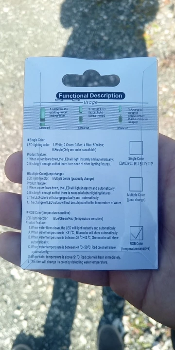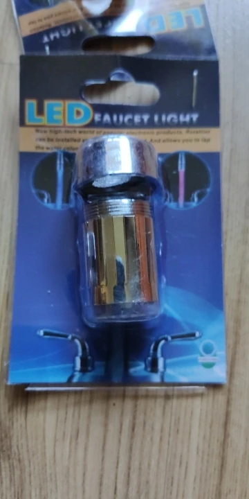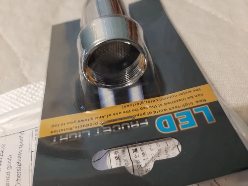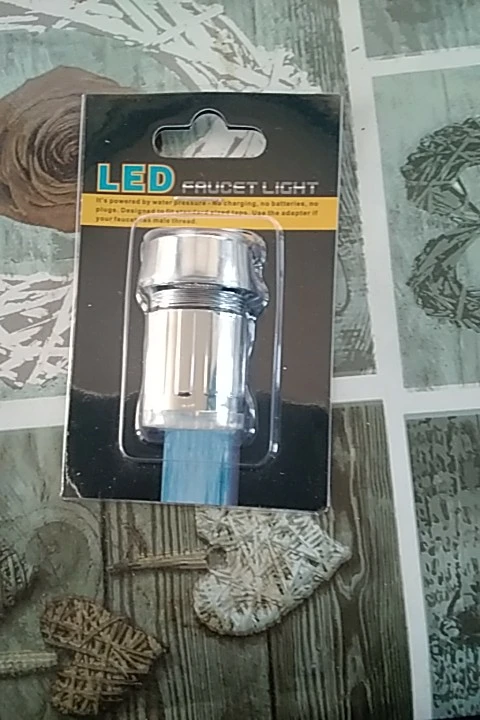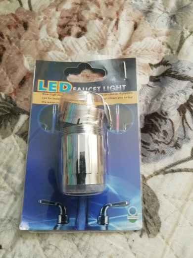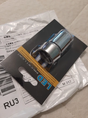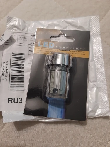 Товар в Россию доставлен за 23 дня. Упаковка не повреждена. Товар соответствует предложению продавца в упаковке и с насадкой. На кране держится уверенно не протекает. Светится тремя цветами.