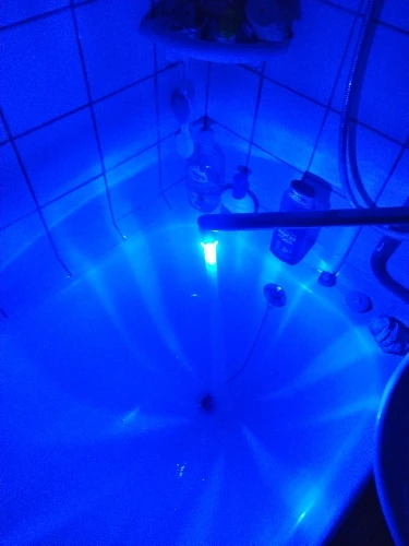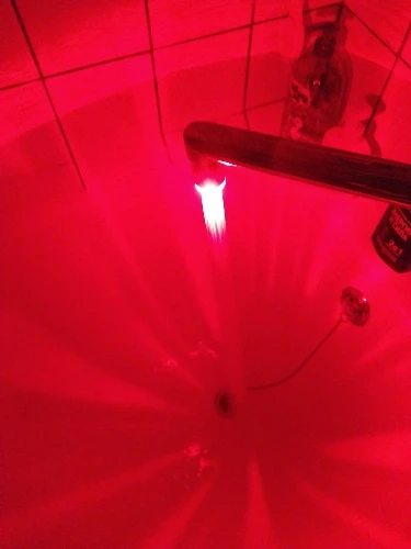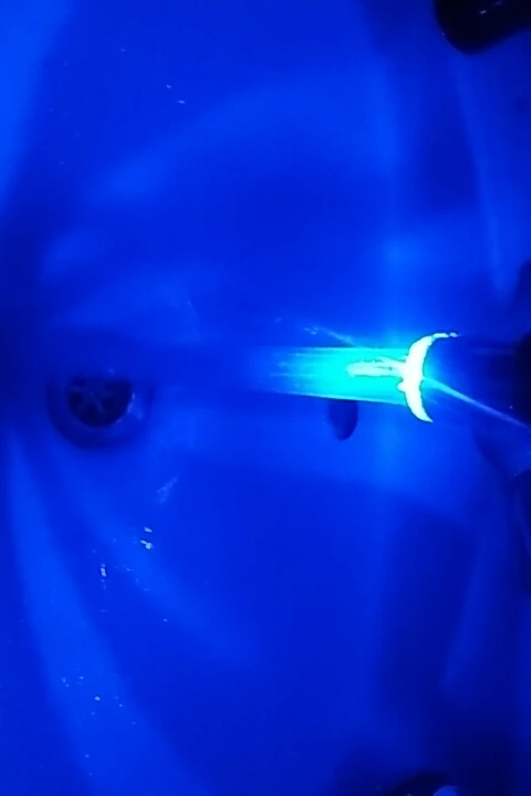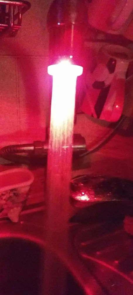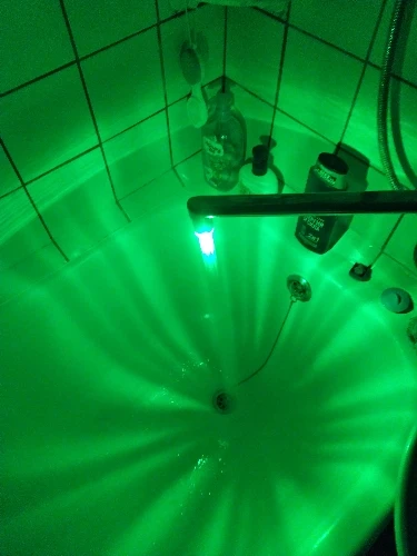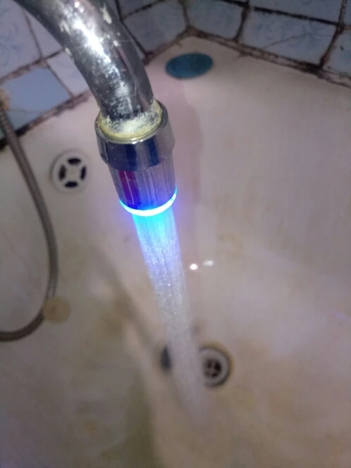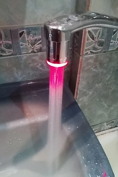Светится разными цветами в зависимости от температуры воды (синий, зеленый, красный).