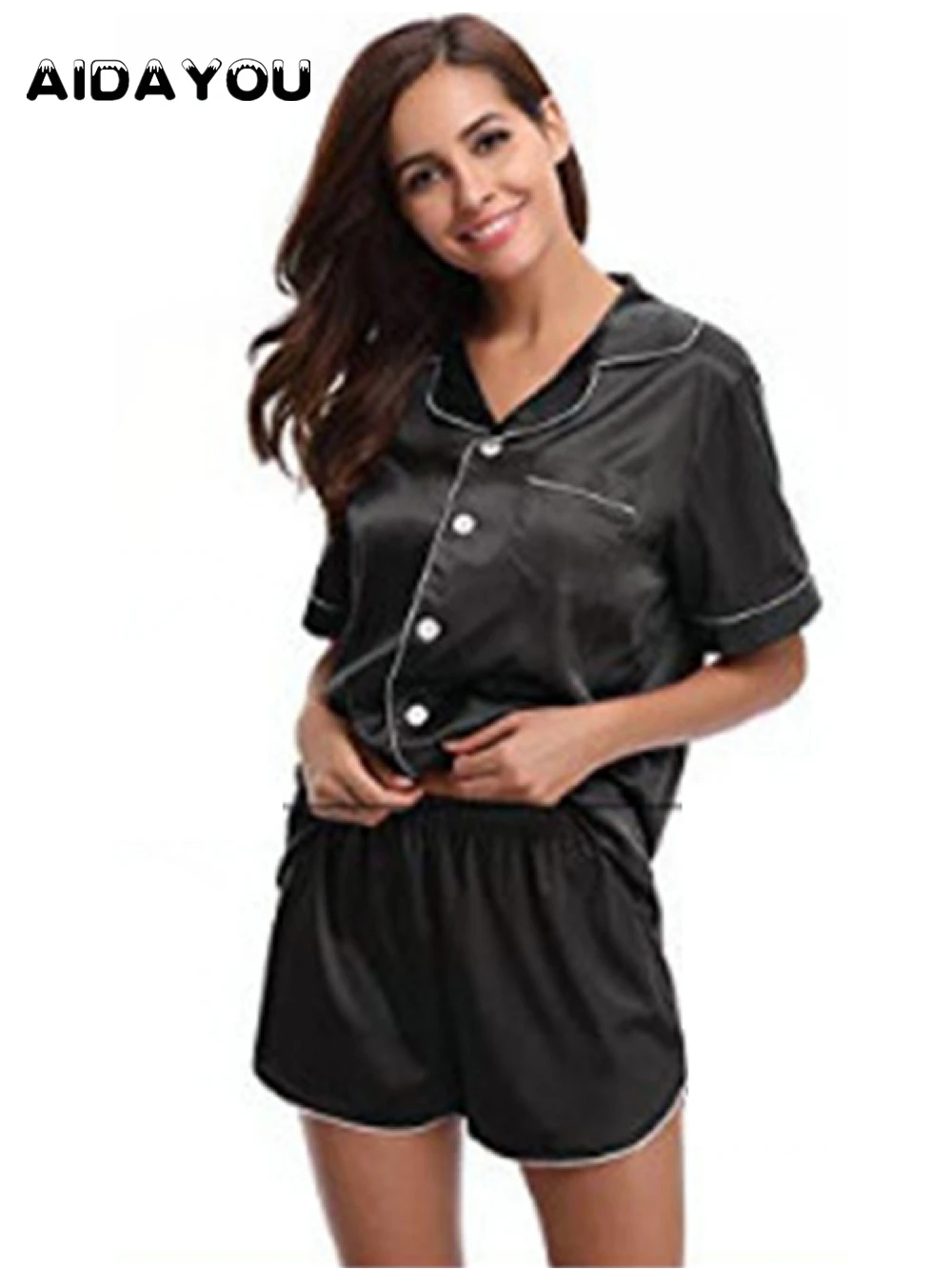 Пижама, комплект из двух предметов, атласная пижама с коротким рукавом и пуговицами, корейский стиль, Шелковый пижамный комплект, ouc413a