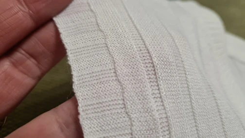 Тонкая синтетика, сшито не плохо, цвет пудровый. На лето или как база подойдёт. На ог98 от 78 хорошо. Спасибо.