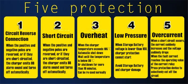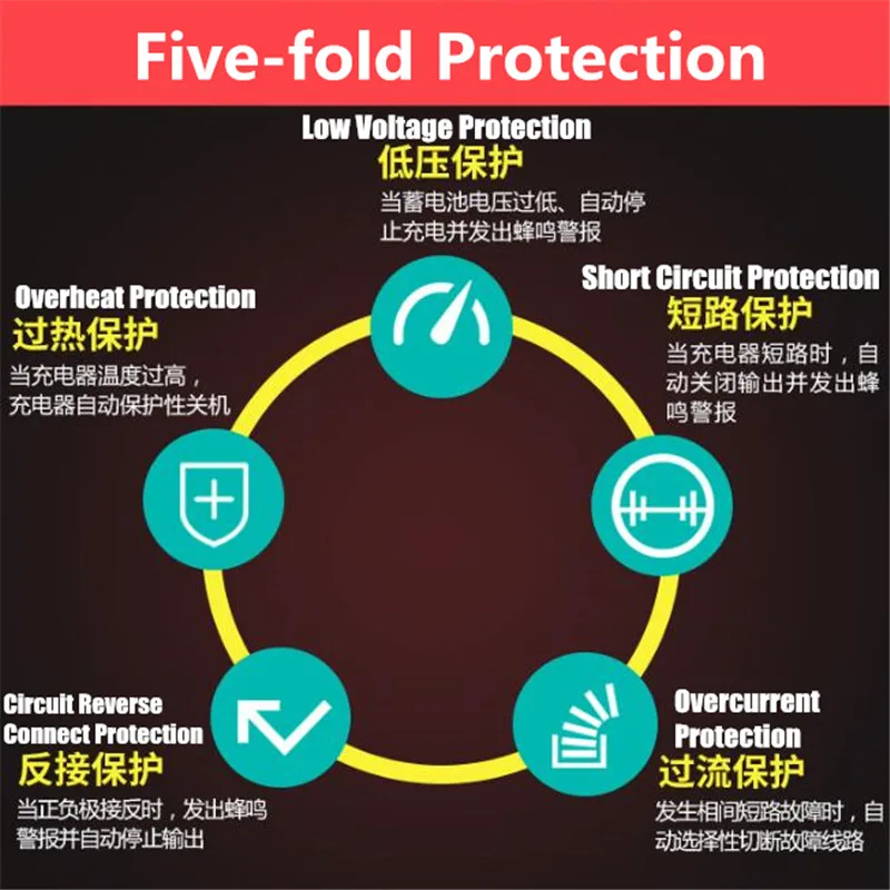 Множественная защита: «обратное соединение цепи, короткое замыкание, низкое напряжение, перегрев, Перегрузка по току, перенапряжение»