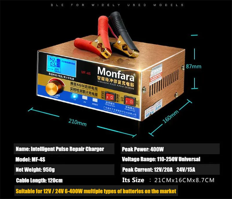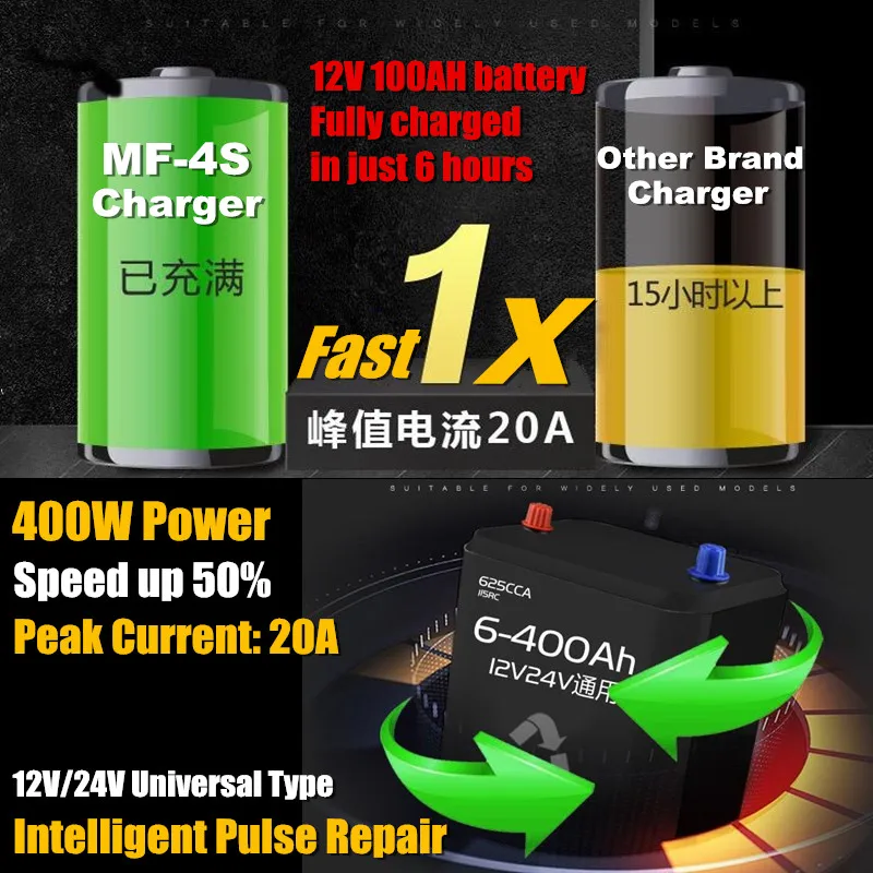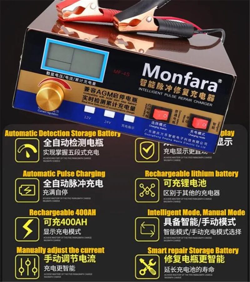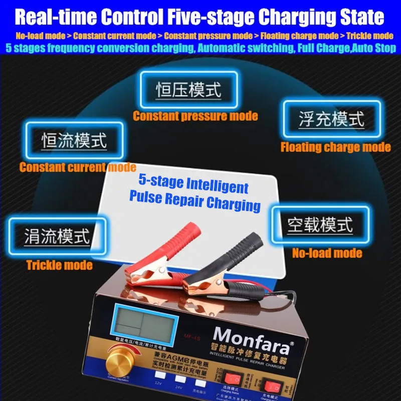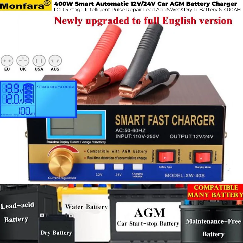 400 Вт умный автоматический 12V/24V автомобиль с клапанным регулированием Батарея Зарядное устройство ЖК-дисплей 5-ти ступенчатый интеллигентая (ый) ремонт импульса свинцово-кислотная & Wet & Dry Li-Батарея 6-400AH