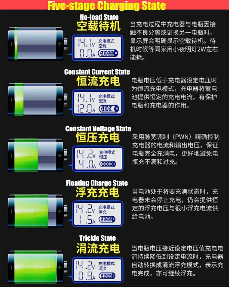 Для аккумуляторов менее 100 Ач или больше время зарядки в режиме постоянного тока будет немного дольше на начальной стадии, процент дисплея зарядного устройства будет отложен, подождите, пока Режим постоянного напряжения, режим непрерывной зарядки будет сокращен, Процент зарядного устройства в это время дисплей ускорится и не повлияет на эффект зарядки.