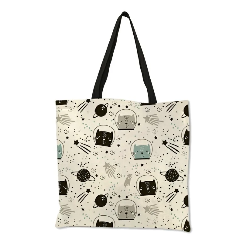 Сумка-тоут женская льняная, многоразовая, с принтом кошки, 2019