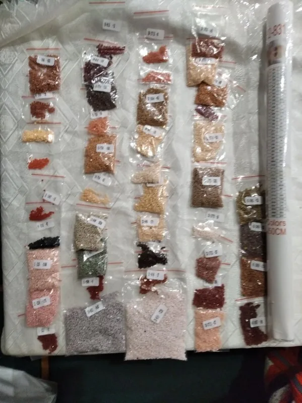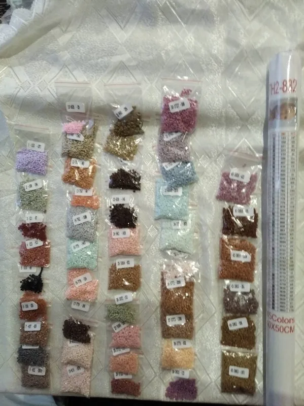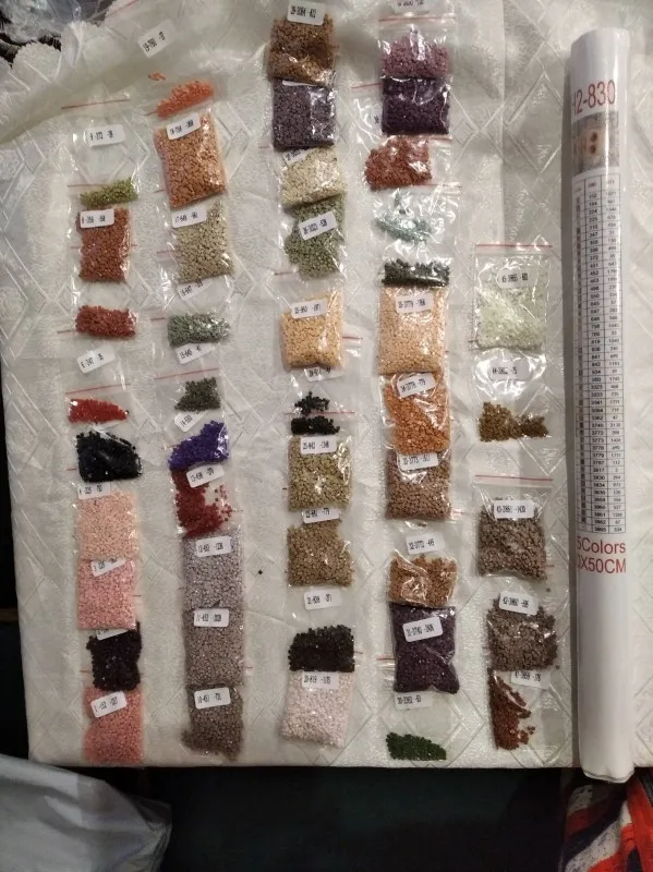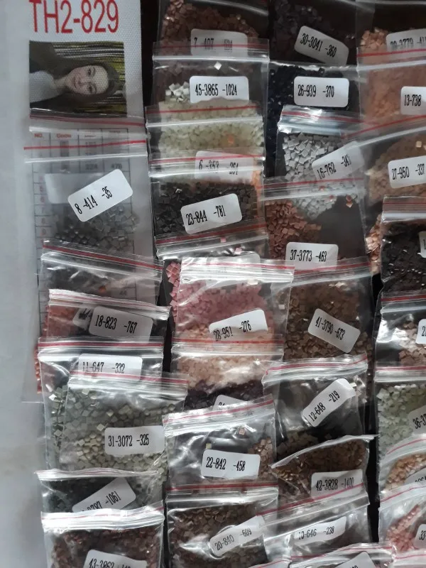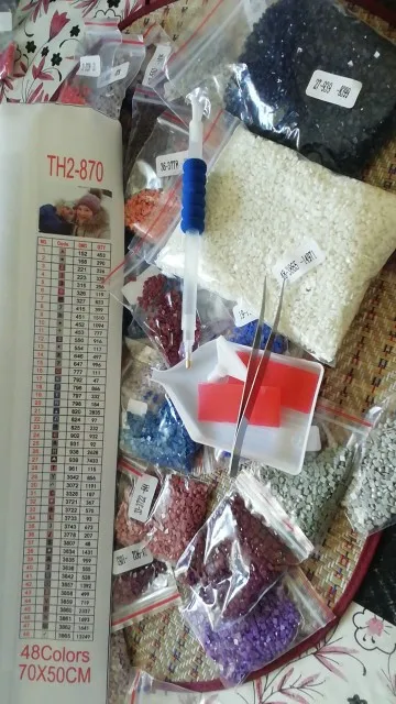 все супер, довольна, заказала по фото три картины, размер 40*50 см, 45 цветов в каждой, полотна намотаны на валик, стразы в зип пакетах, инструмент простой, доставка быстрая, рекомендую