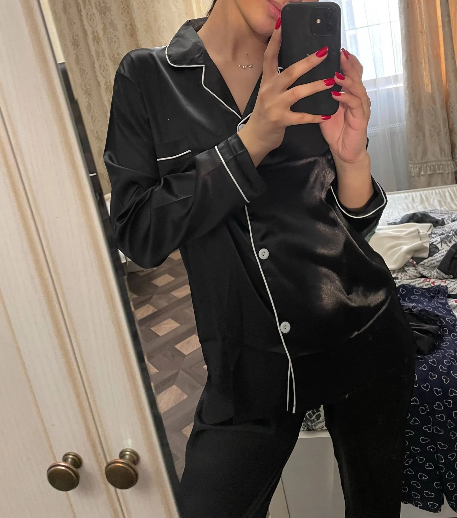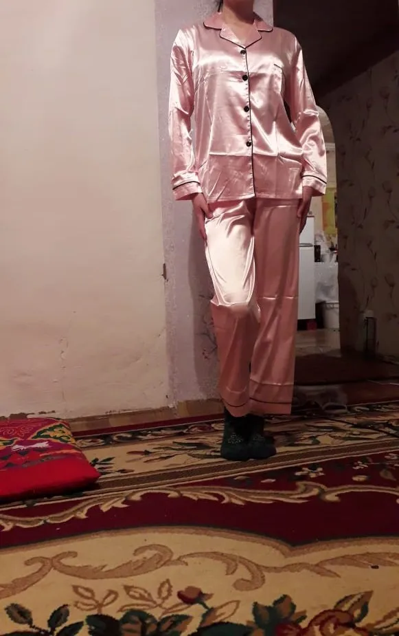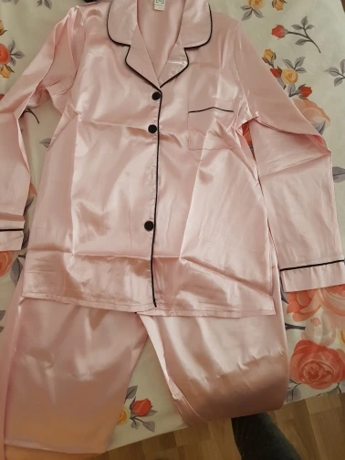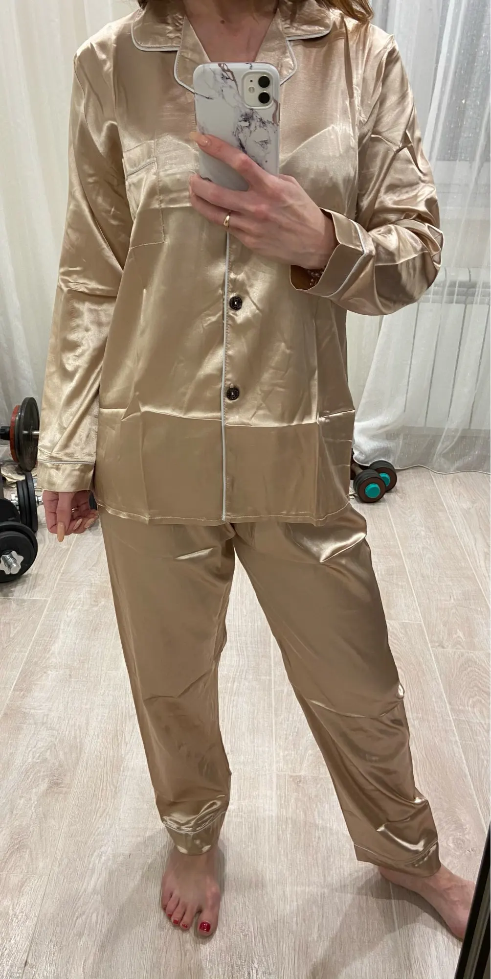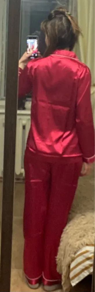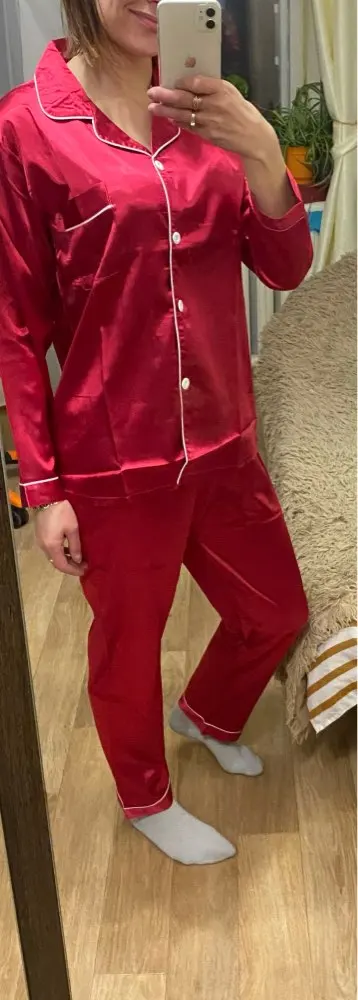 Красивая пижама.Всё ровно. Синтетика. Прилипает к телу. Спать нет, а по дому пофорсить норм. Заказала XXL на параметры 90/70/100. Российский мой где то 46 размер. Можно было на размер меньше. Рубашка очень свободно. На фото не так это заметно.