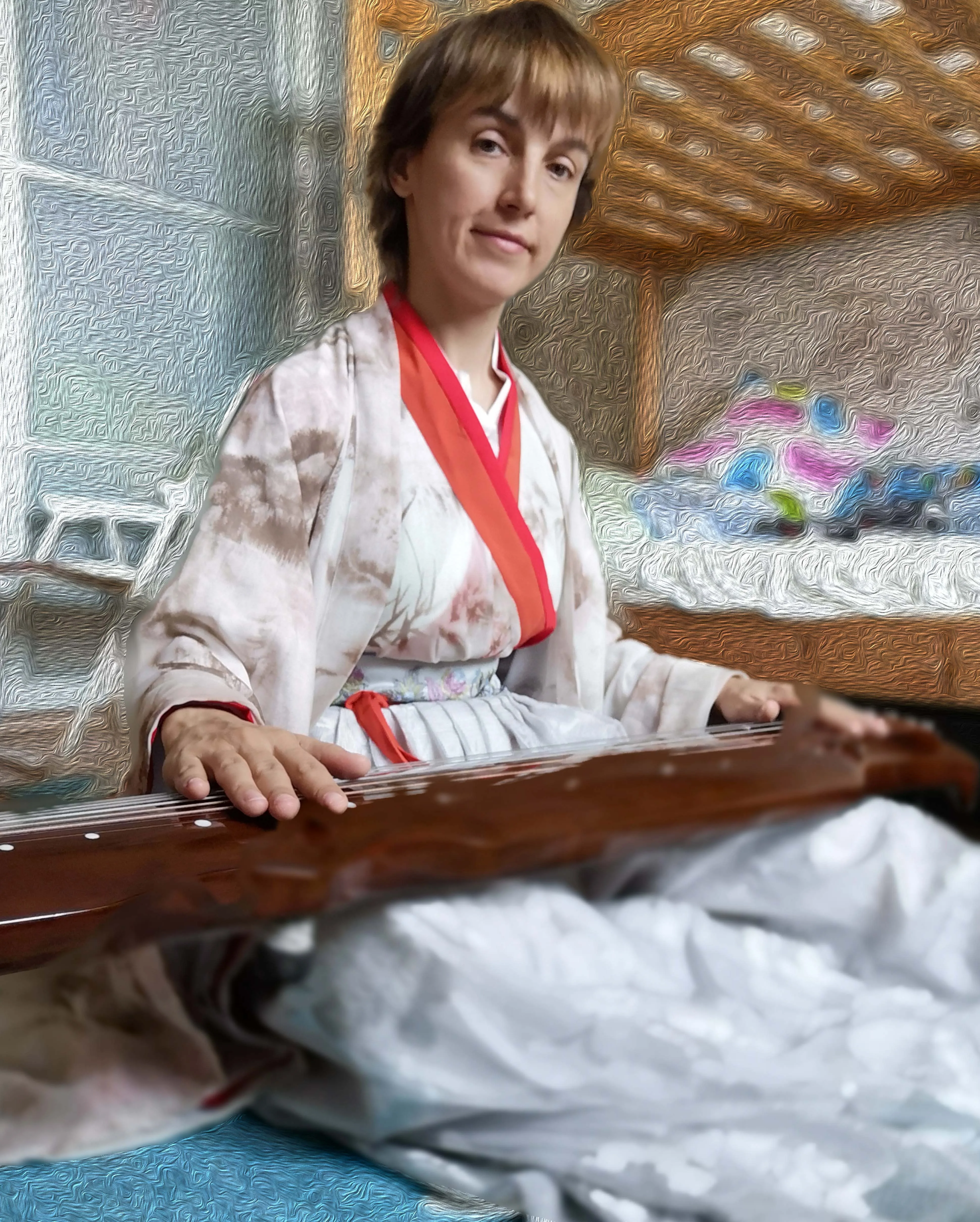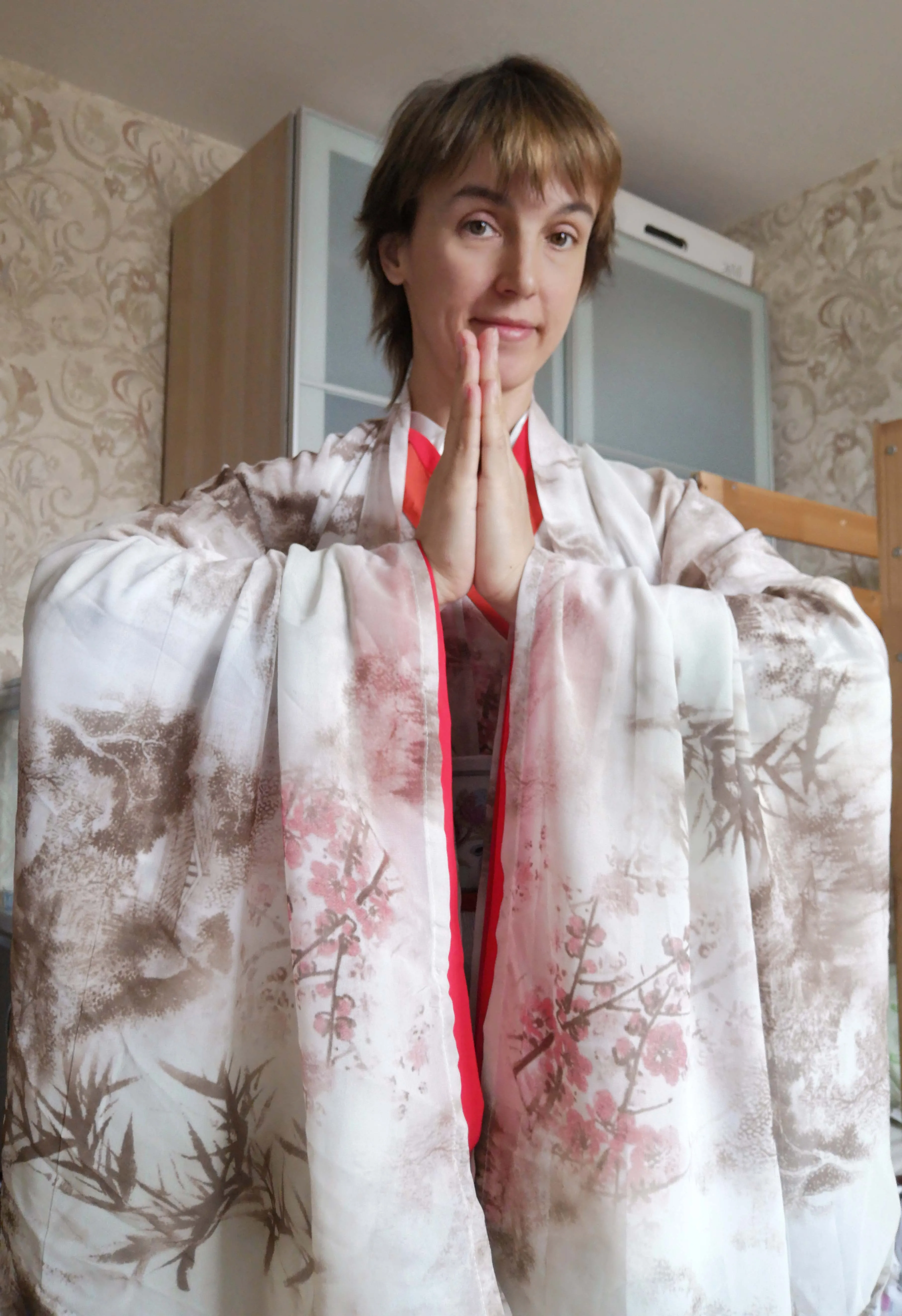 На ханьфу описания не было; только фото. Брала на свой риск! В целом смотрится красиво. Я довольна. Фото соответствует. Презент - заколка для волос - спасибо большое! НО - юбка меня расстроила (а именно, что сверху материал тюль в сеточку - на фото этого не видно) - состоит из двух юбок: нижняя юбка белая и сверху вторая юбка - материал серого цвета с цветочным рисунком (тюль в сеточку). И еще для меня большой минус - ханьфу полностью синтетика - "липнет" и "щелкает". На объем груди 88; талия 71, бедра 92 взяла размер М. На рост 164 см - юбка до пола. Состоит: юбка двойная цельно сшитая - и ближе к талии разделяется на две части - на завязках, одна часть пояса с вышивкой; нижняя рубашка белая, на завязках; верхняя рубашка - материал принт с сакурой, каемка - два цвета сшито: алый цвет и второй цвет слегка кирпичный - на завязках, без вышивок; халат - принт бледно-коричневые горы - на рукавах горы плюс цветы сакуры.
