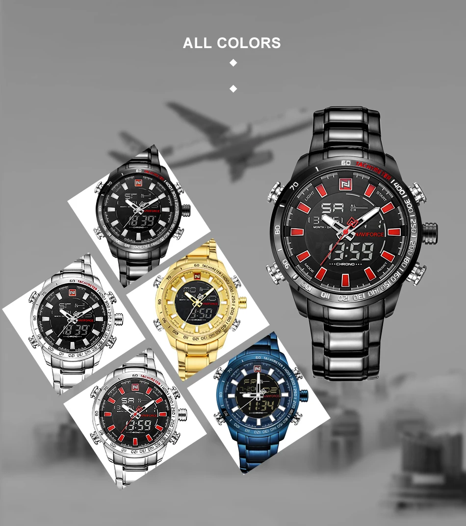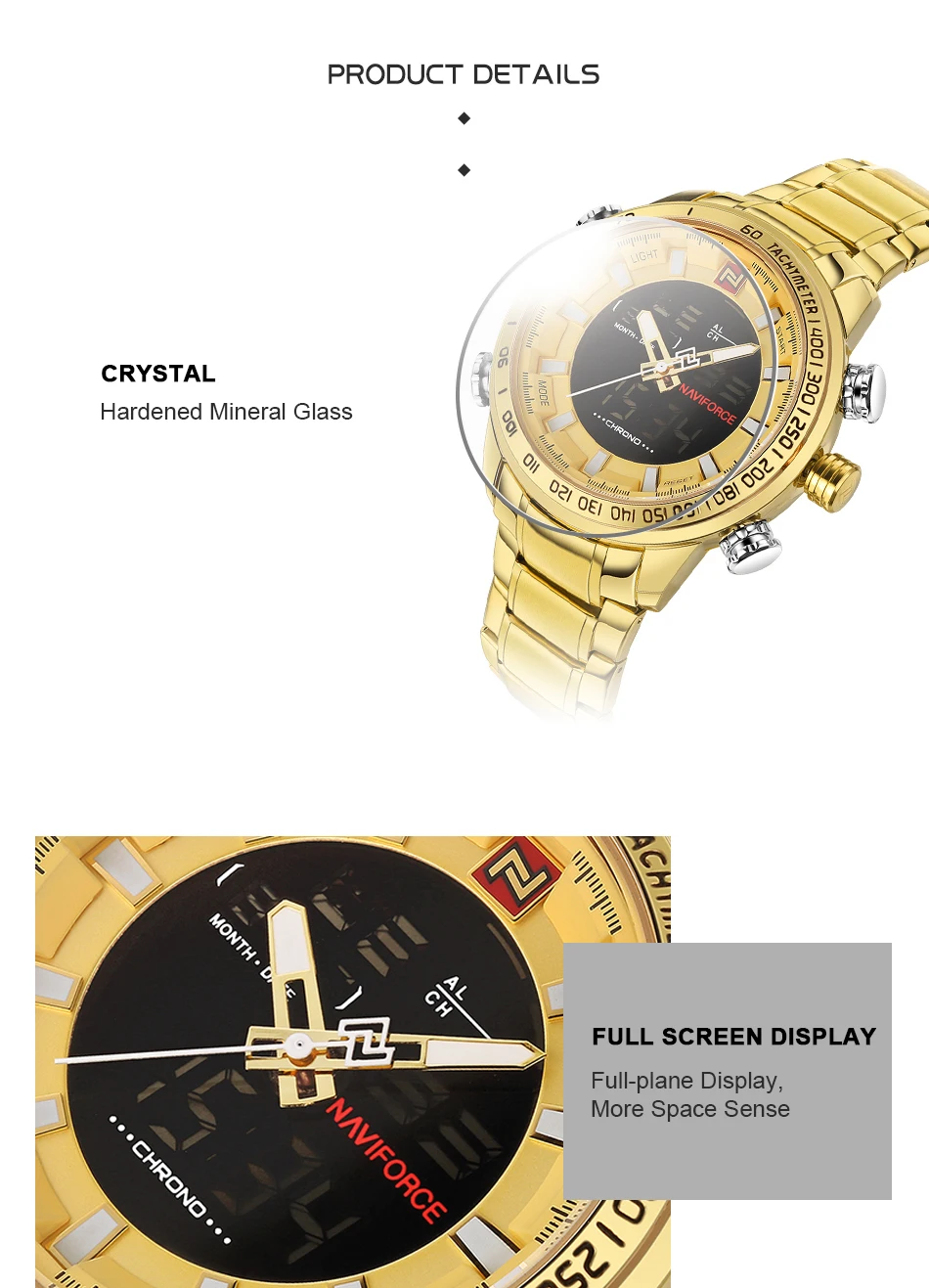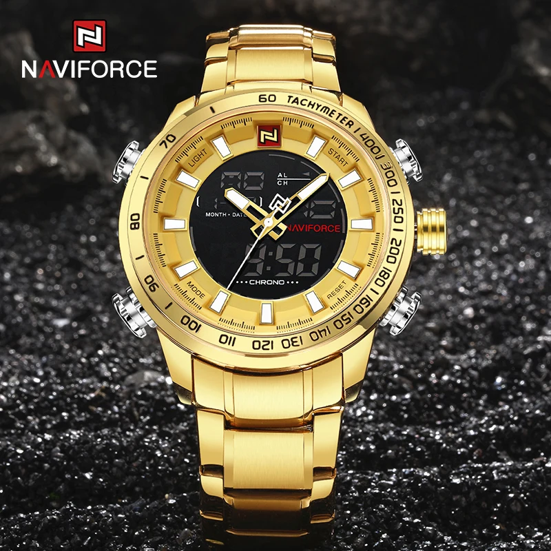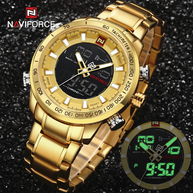 Мужские наручные часы NAVIFORCE, военные, спортивные светодиодный ные, аналоговые, цифровые, с будильником, мужские, армейские, из нержавеющей стали, кварцевые, золотые часы
