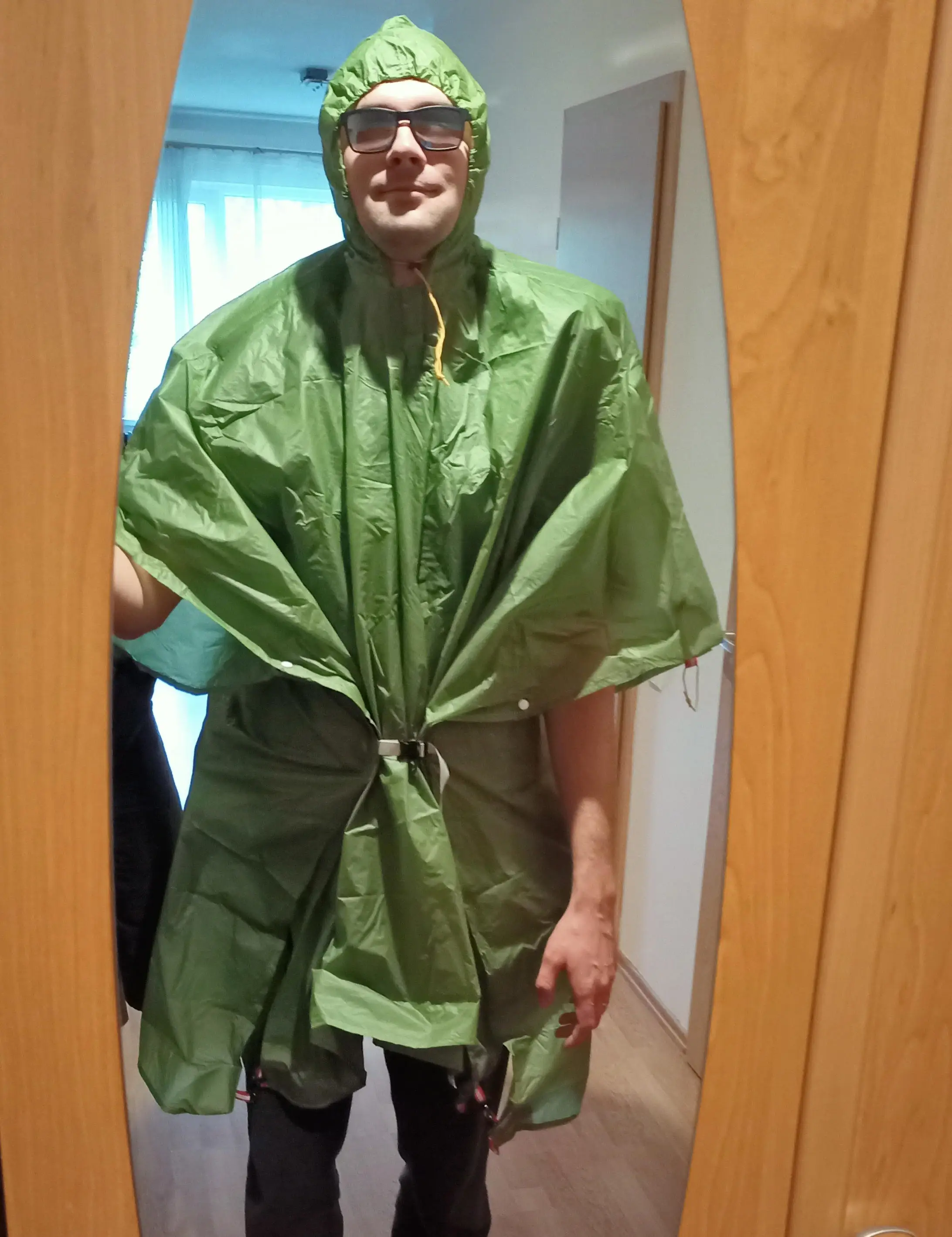 Легкий (200 г весит) хорошее общее качество продукции и хорошая Водонепроницаемость в режиме пончо. Проблема: вырез слишком широкий и закрывается царапиной. В режиме tarp невозможно затянуть под дождем, потому что вода попадает вокруг капюшона. Утечки неизбежны, особенно если есть немного ветра. Цвет не темно-зеленый, как рекламируется, а скорее светло-зеленый, не такой сдержанный, как я ожидал в цвете. Этот продукт был бы идеальным с более узким воротником и более нейтральным цветом