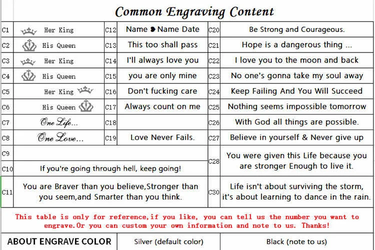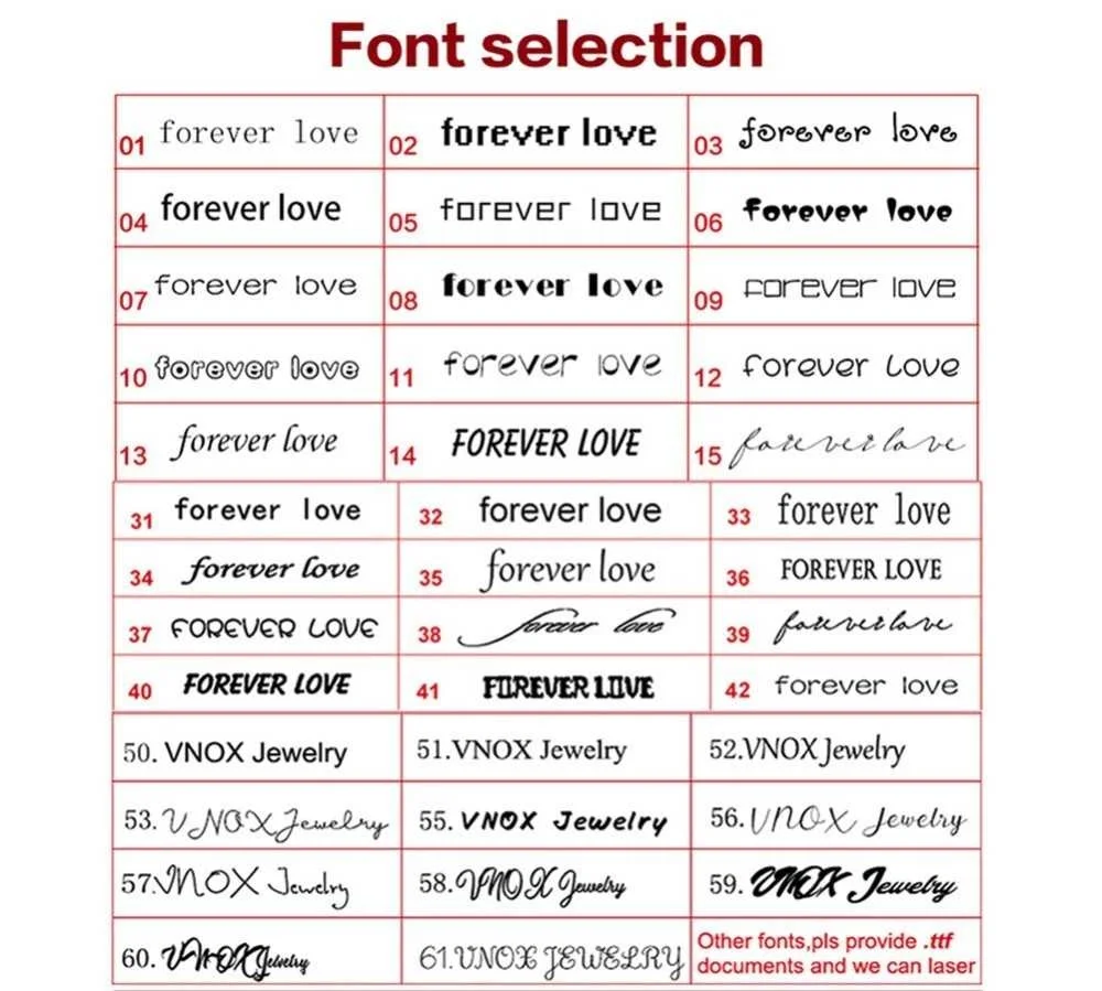Put the image number inside () please. eg: Black font 50, engrave : Lucy (165) forever.