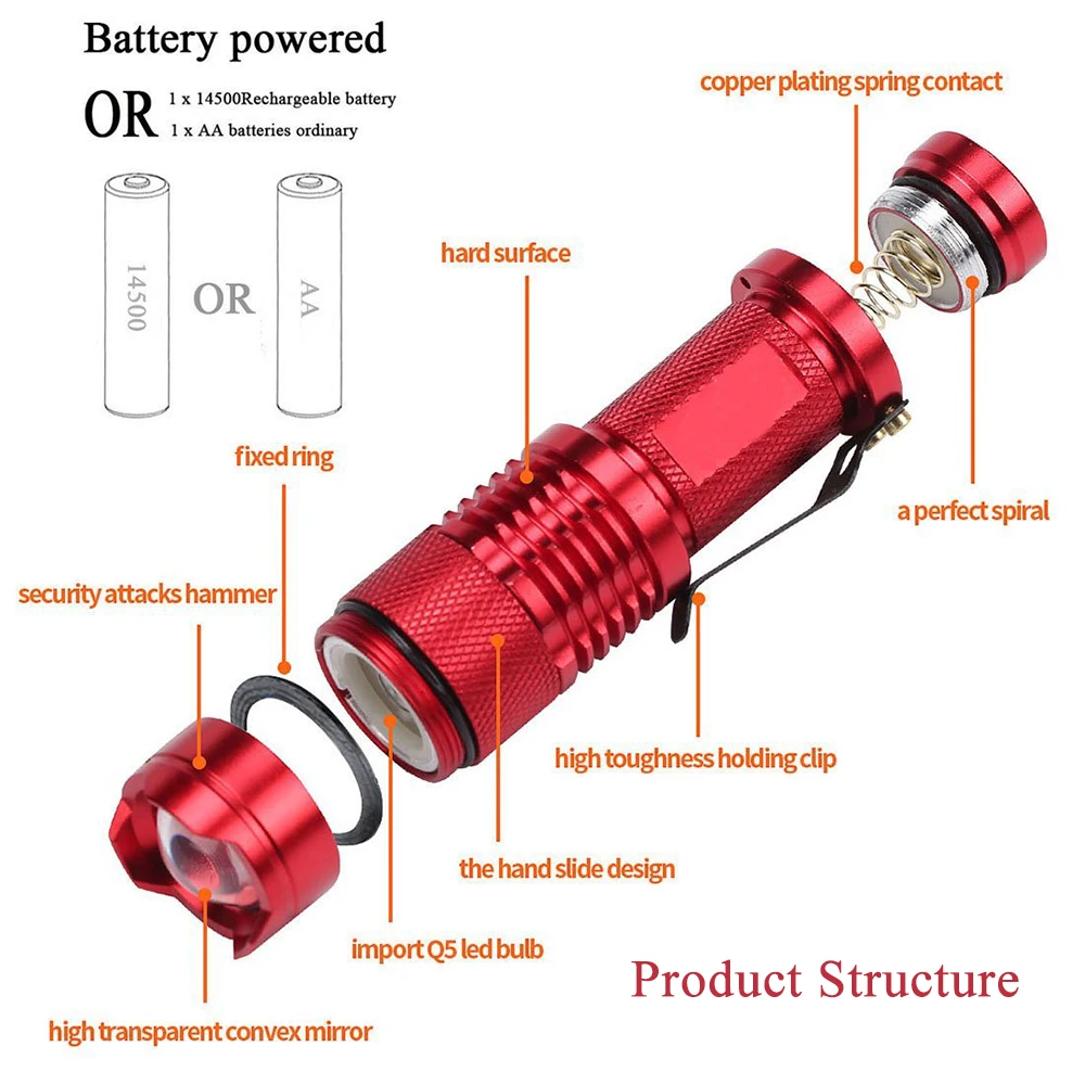 Супер Мини размер, яркий, ослепляющий эффект.Противоскользящий дизайн и водонепроницаемый дизайн.Выходная яркость может достигать 2000 люменов (макс.).Регулируемый диапазон фокусировки для различного использования, растягивается для регулировки фокуса.Зажим для удобной переноски.Рабочее напряжение широкое и может использовать батареи в самой большой степени.Подходит для охоты, велоспорта, альпинизма, кемпинга и активного отдыха и т. д.