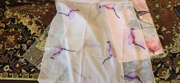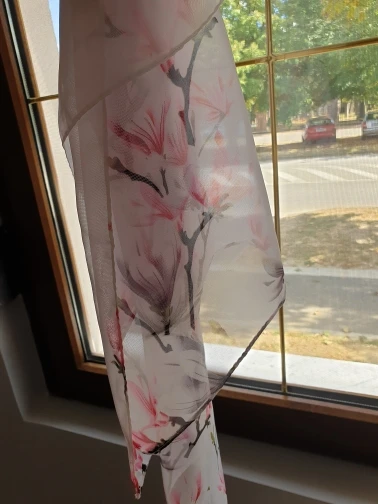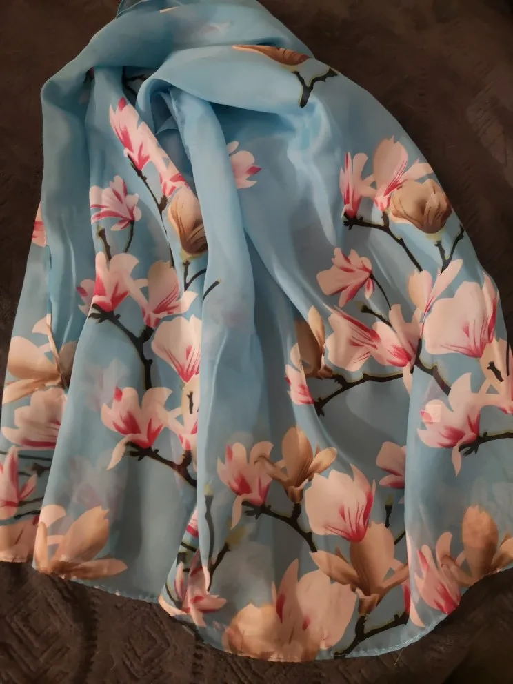 Шарф картинке соответствует. Принт чёткий. Цвет нежный. Сама ткань мягкая, приятная. Буду ждать весну, чтобы пользоваться. Для наших сибирских морозов не подойдёт. Доставка чуть больше месяца. Посылка отслеживалась. Продавцу спасибо. Удачи и процветания!!!