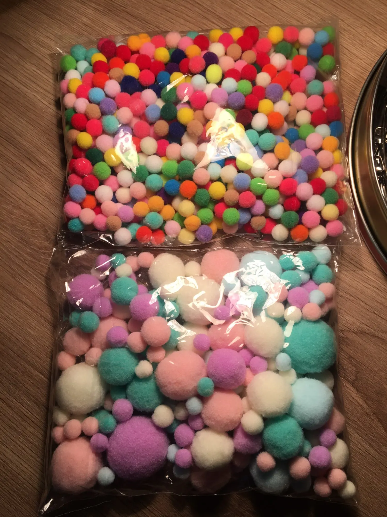 Помпоны одинакового размера, цвета яркие. Покупкой довольна, спасибо.