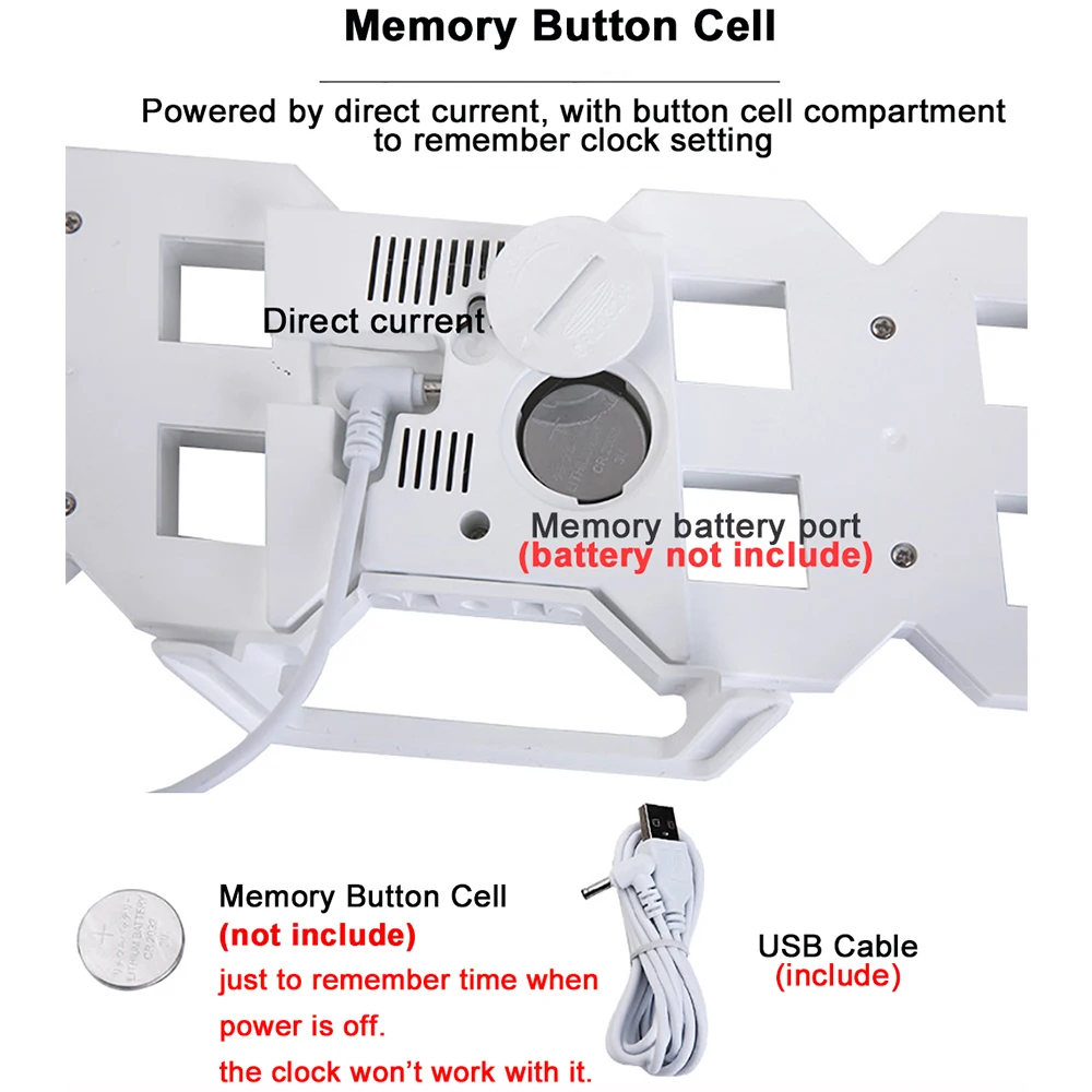 Примечание: -Кнопочная ячейка предназначена только для записи набора часов(Не включено, необходимо покупать отдельно) -При подключении к адаптеру постоянного тока или кабелю USB часы отобразят время -При тревоге сигнализация прекратится, если подключить адаптер постоянного тока или USB-кабель