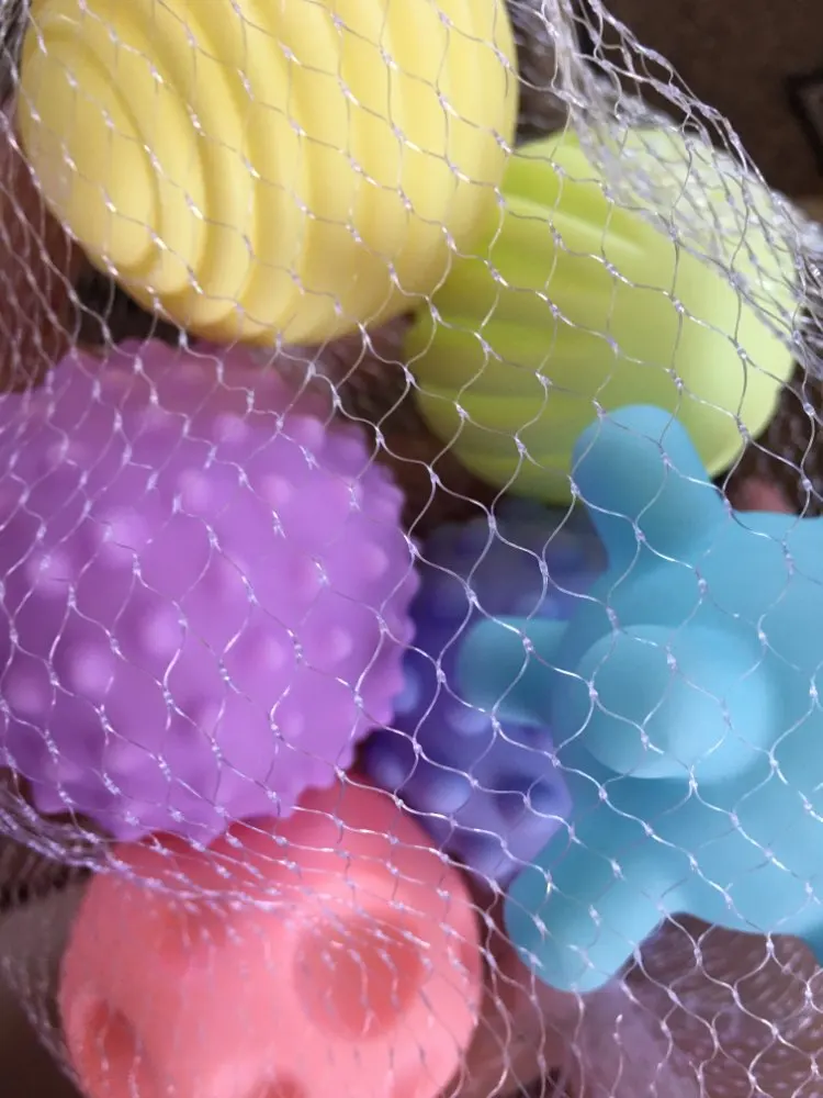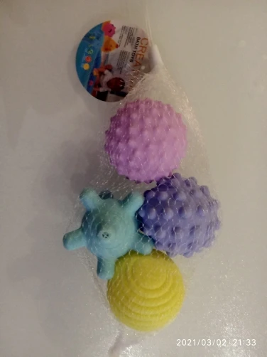 Посылка была собрана в одну от нескольких магазинов, поэтому заказ доставили очень быстро. Упаковали аккуратно, ничего не помялось и не испортилось. Хорошее качество пластика. Без запаха, гладкий и приятный на ощупь. Описание товара соответствует полностью. В нашем комплекте было четыре разных игрушки два мячика с пупырышками, один с полосками и один больше похожий на ёжика. Цвета не яркие, приятные. Размер как раз, малышу в 4 месяца двумя руками обхватить достаточно удобно. Первое впечатление хорошее. Посмотрим как будут в эксплуатации, особенно когда прорежутся зубки. Обязательно дополним впечатления. Продавцу спасибо !