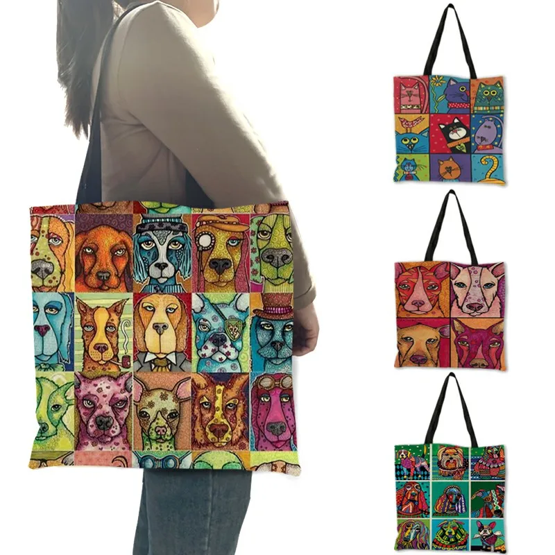 Сумка женская многоразовая льняная, с изображением собак, кошек