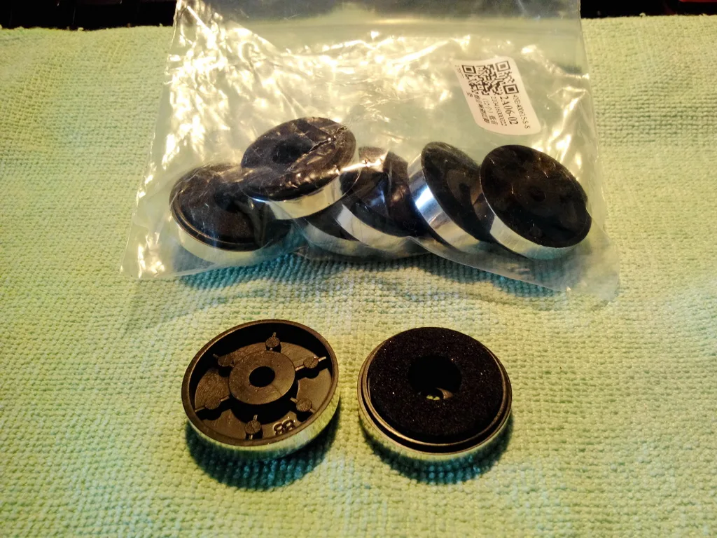 Заказал 24/6, отправили 26/6, пришло в Питер 11/7. Ножки неплохие, особенно если вблизи не рассматривать. Пластик с покрытием под хром, снизу довольно упругая пенка. Одну из двенадцати умудрились наклеить вкось. Под самодельные устройства с претензией на хай-энд самое то. Наверное ещё жёлтых закажу...