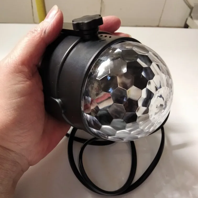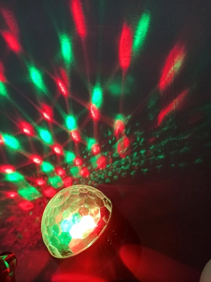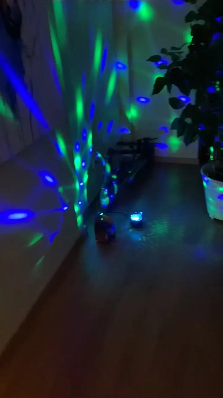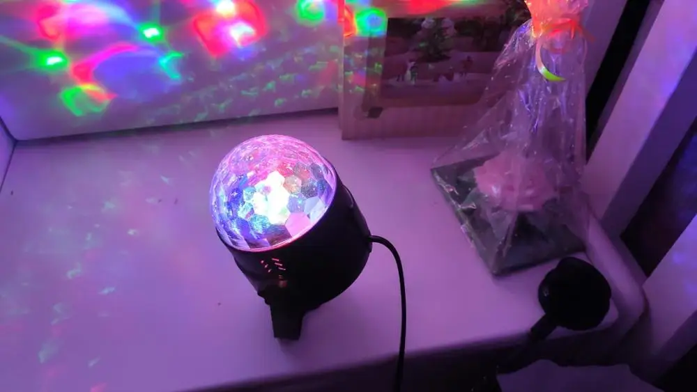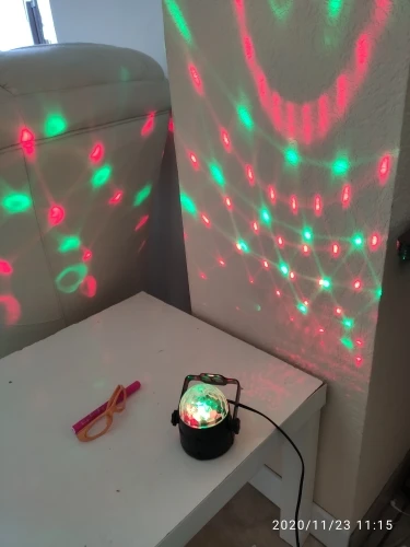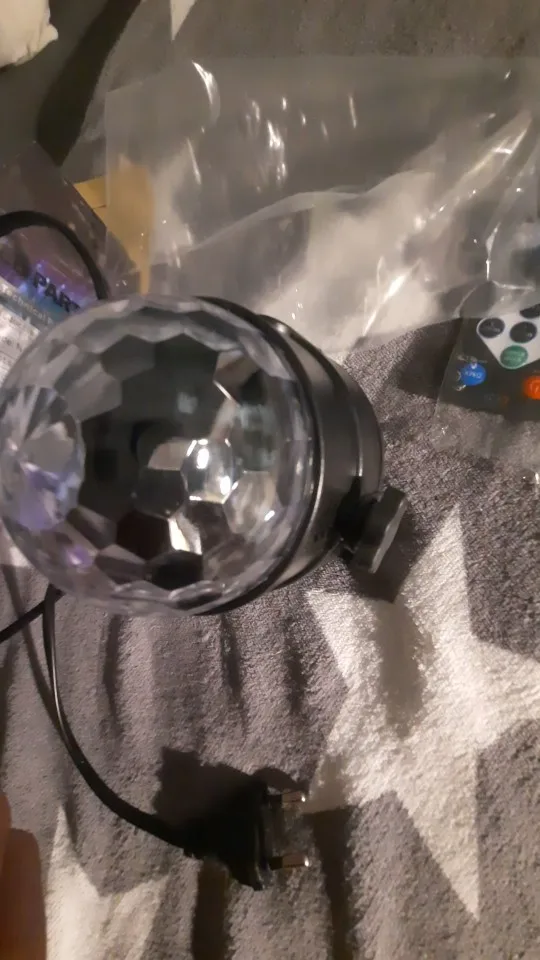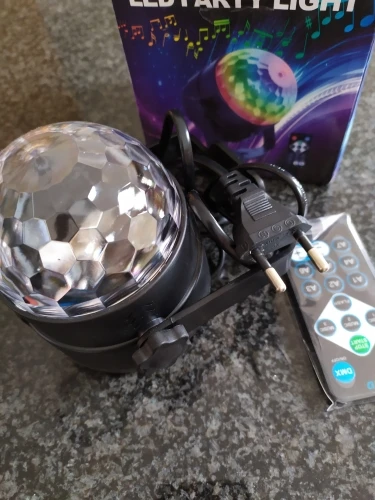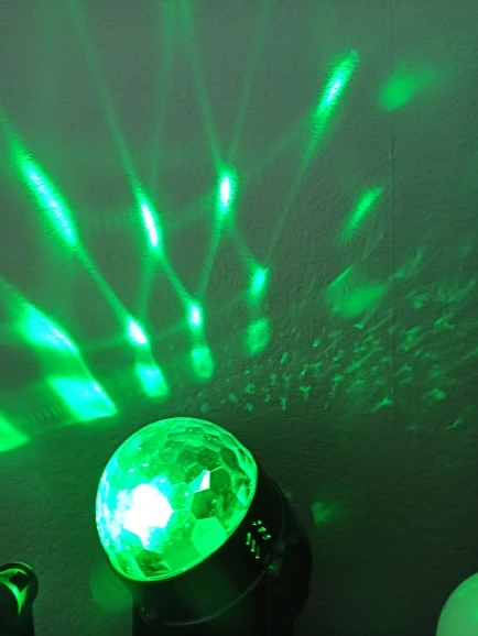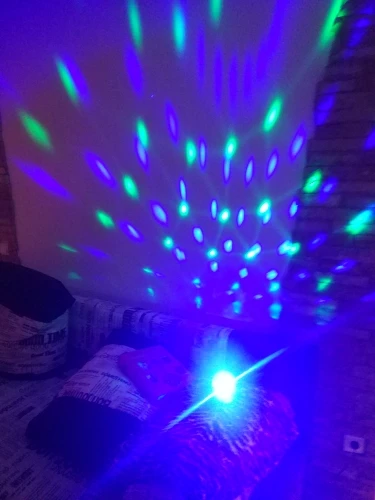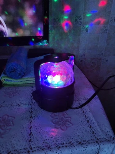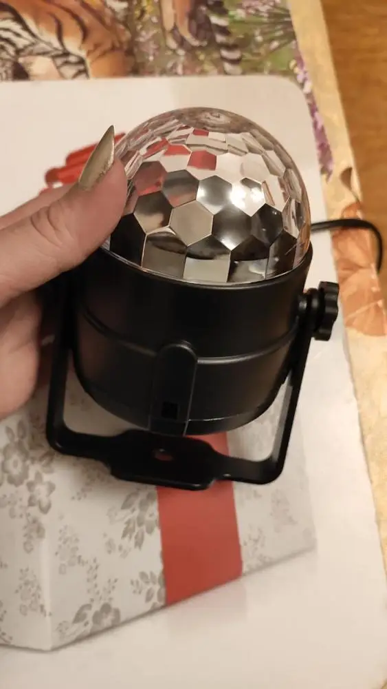 Прикольный диско шарик, светит хорошо, все работает. Чтобы начал светить под музыку, надо почти совсем прислонить его дырочкой к колонке, тогда начинает реагировать. В целом нравится, для дома для детей - самое то) за такие деньги) доставка быстрая, упаковка хорошая.