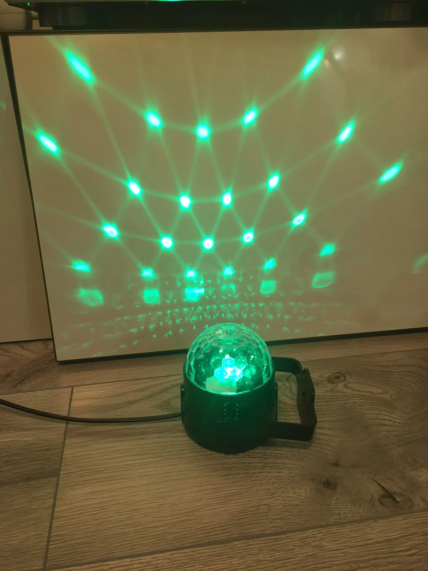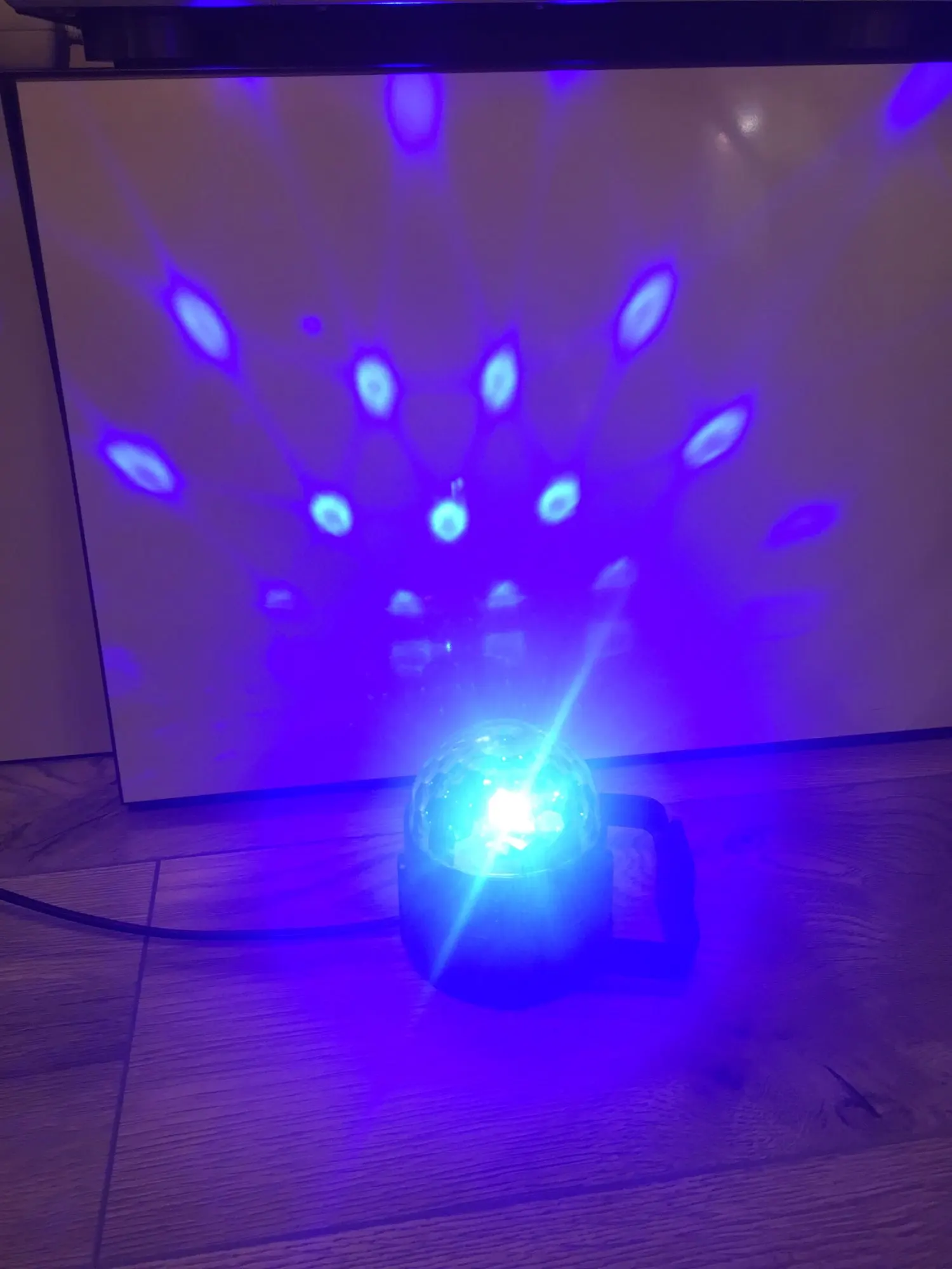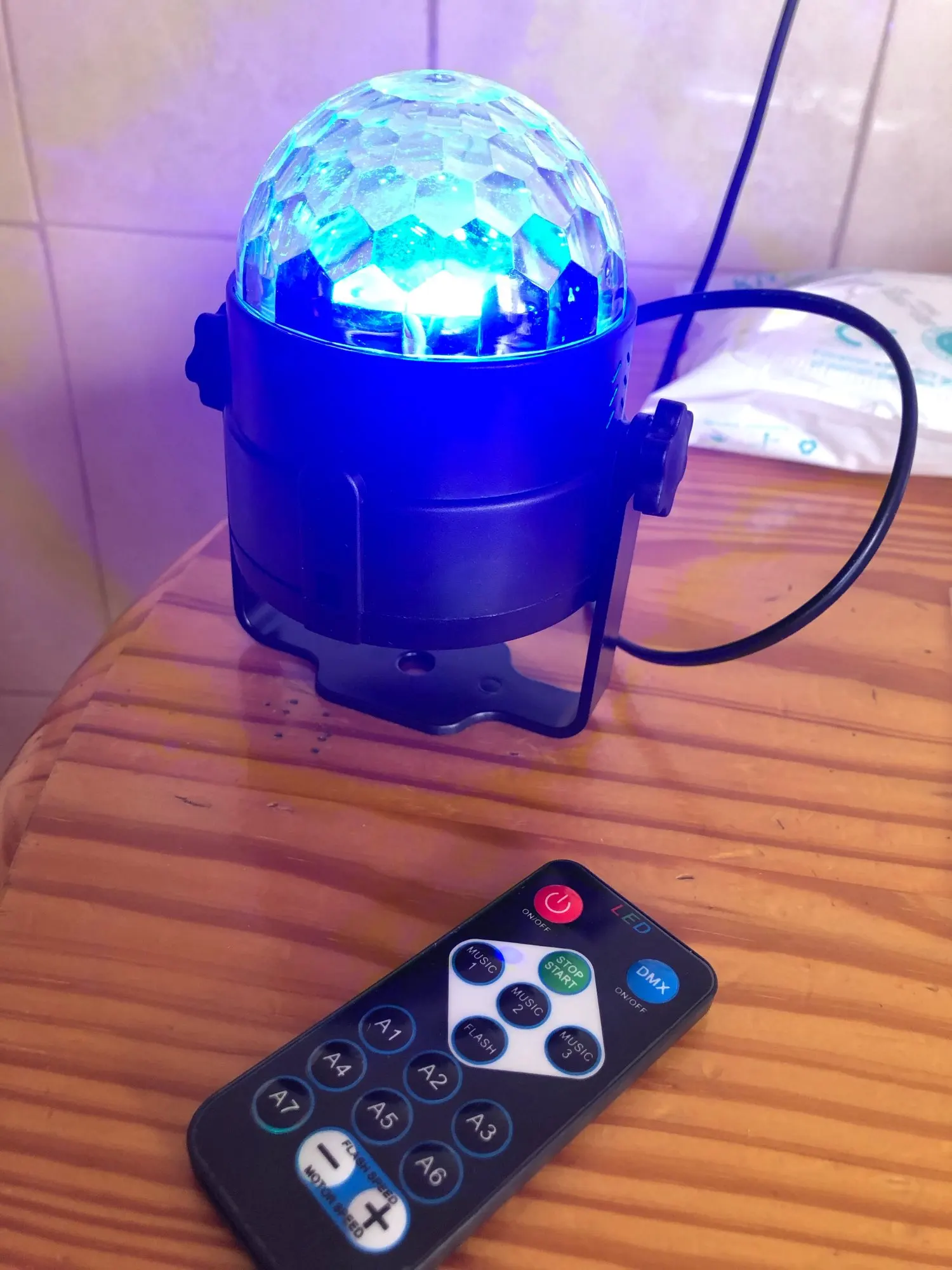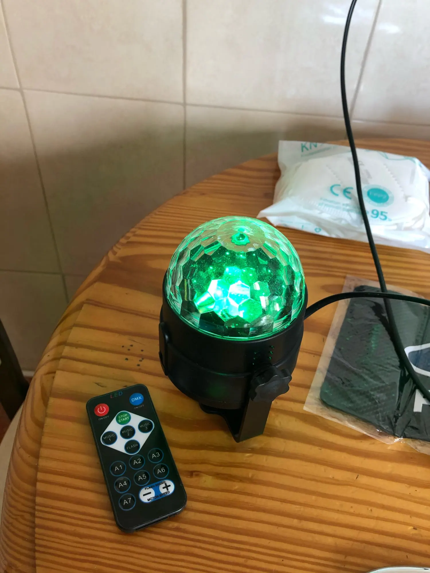 Прикольный диско шарик, светит хорошо, все работает. Чтобы начал светить под музыку, надо почти совсем прислонить его дырочкой к колонке, тогда начинает реагировать. В целом нравится, для дома для детей - самое то) за такие деньги) доставка быстрая, упаковка хорошая.