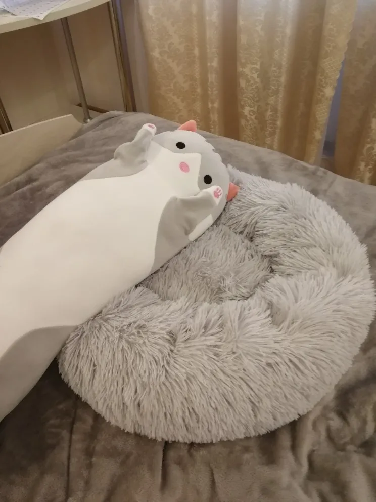 Очень мягкое. Кот даже испугался такой мягкости. Более суток боялся ложится. На второй день удалось ему поспать, но это только для пола. На диване, пуфике (как на фото) легко может упасть. Брал размер 60 см. До Словакии посылка шла более месяца.