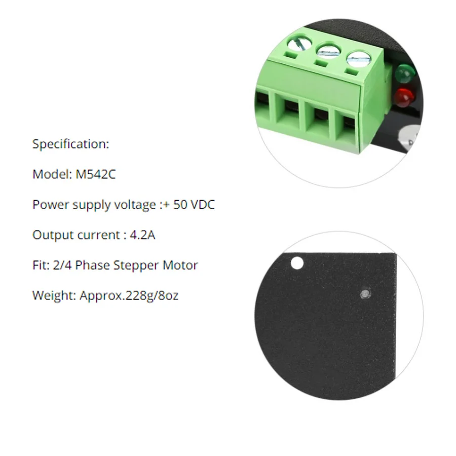 Хорошая высокоскоростная работаНапряжение источника питания до 50 В постоянного тока, выходной ток до 4,2 АМетоды саморегулировки, технология управления чистым синусоидальным токомВходная частота импульса до 300 кгц. TTL совместим с оптическим изоляционным входомПятимерное необязательное разрешение, двоичное до 25600 шагов/вращенийПодходит для 2-фазных и 4-фазных двигателейПоддержка режимов PUL/DIR и CW/CCWС защитой от короткого замыкания, перенапряжения, перегрузки по току Спецификация: Модель: M542C Напряжение источника питания: + 50 В постоянного тока Выходной ток: 4,2 А Подходит: 2/4 фазный шаговый двигатель Вес: прибл. 228 г/8 унций