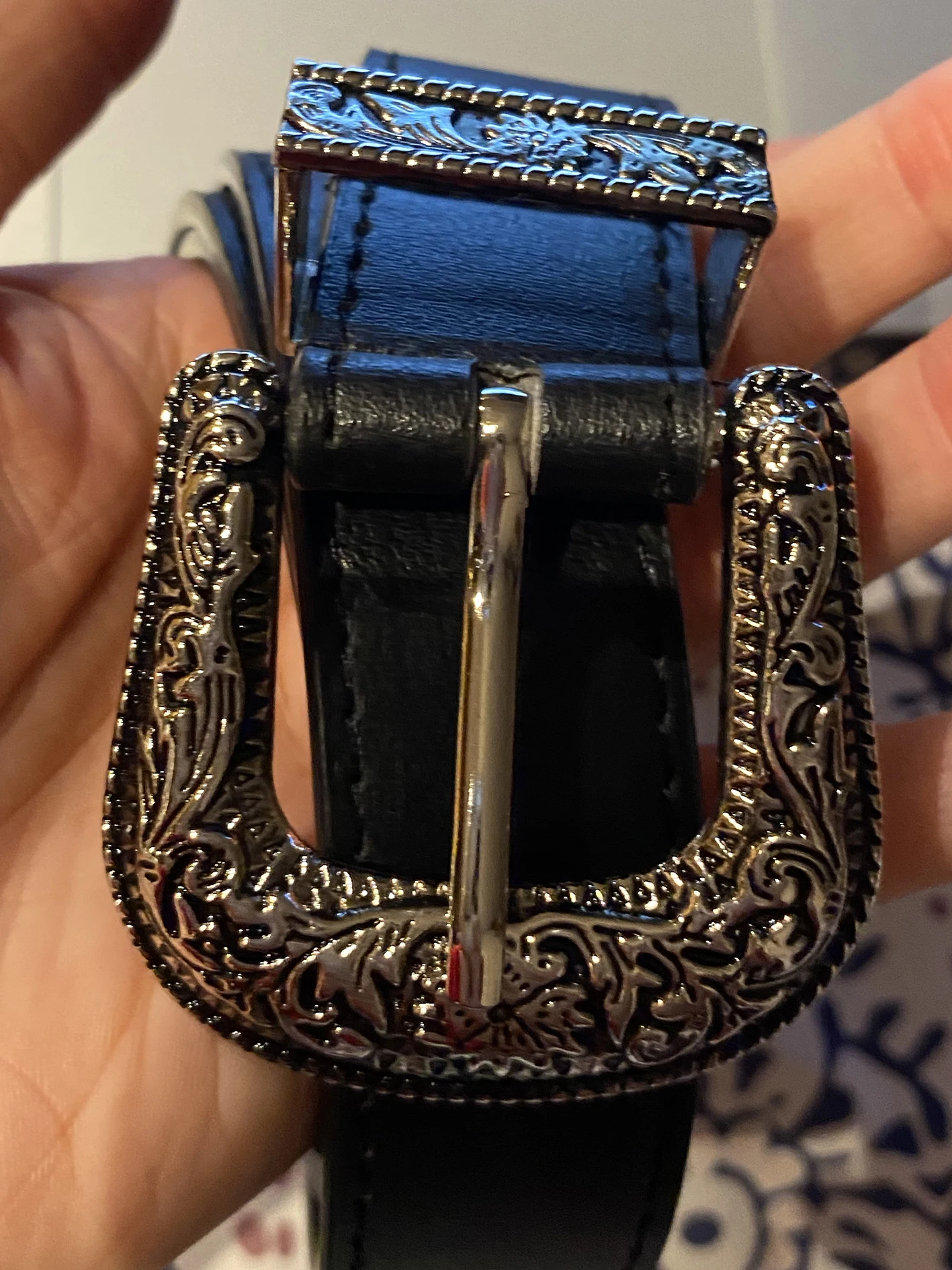 Точно как на фото. Изделие очень хорошего качества и пахнет самой кожей. Он не весит пряжку, и я надеюсь, что она не деформируется сразу
