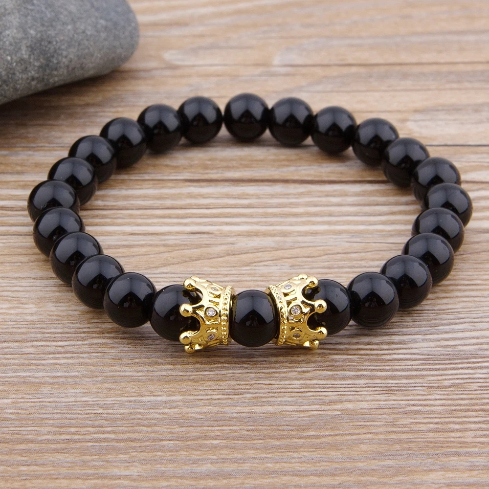 TYO роскошные мужские и женские высшего качества Золотой Лев CZ Корона Шарм 8 мм яркий натуральный камень черный браслет из бисера для пары ювелирные изделия подарок
