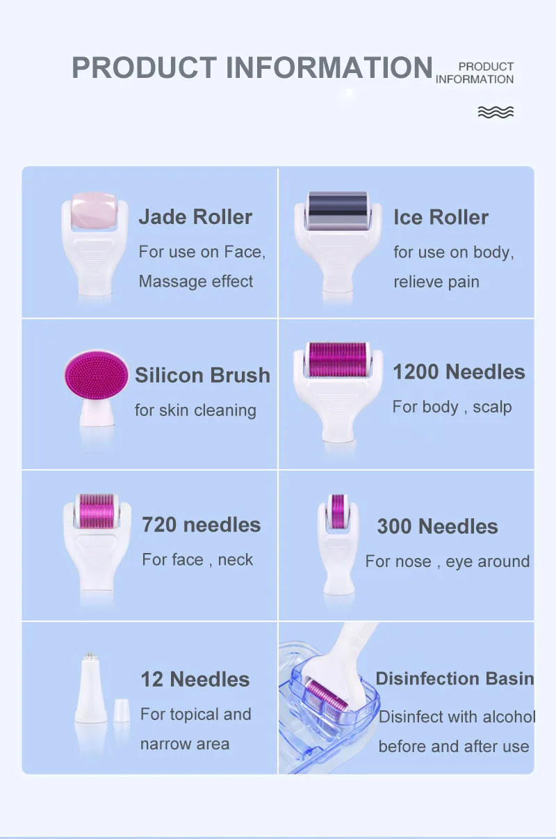 Тип 16 в 1 посылка в комплекте1x12 игл derma штамп1x300 игл роликовая головка1x720 игольчатая роликовая головка1x1200 игольчатая роликовая головка1x силиконовая щетка1x дезинфекционный умывальник1x ИнструкцияНабор DermarollerГоловка ролика корпуса: 1200 контактовГоловка роликового ролика: 720 контактовГоловка ролика для глаз: 300 контактовШтамп: 12 контактовОсобенность набора dermaroller 6 в 1:A: Интегрированная герметичная посылка:1. Очень портативный2. Удерживайте все ролик дермы вместе3. Всегда держите Дерма ролик стерильным B: внутренний дезинфекционный бак с фиксированным положением для роликовой головки: стерилизовать роликовую головку спиртом C: ультра-острые наконечники иглы легко проникают в кожу D: Поворотная модель головки. Более стабильный и удобный E: неэкранированный дисплей логотипа, чтобы показать ваш бренд F: очеловечивание противоскользящий дизайн ручки, чтобы сделать ручку можно держать прочно и комфортно Г: очистите лицо щеткой перед обработкой дермароллера