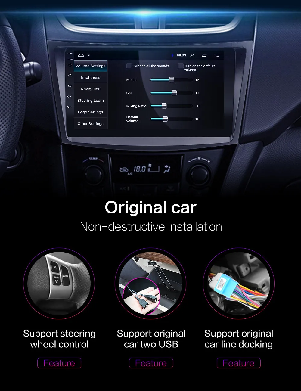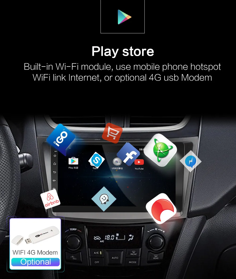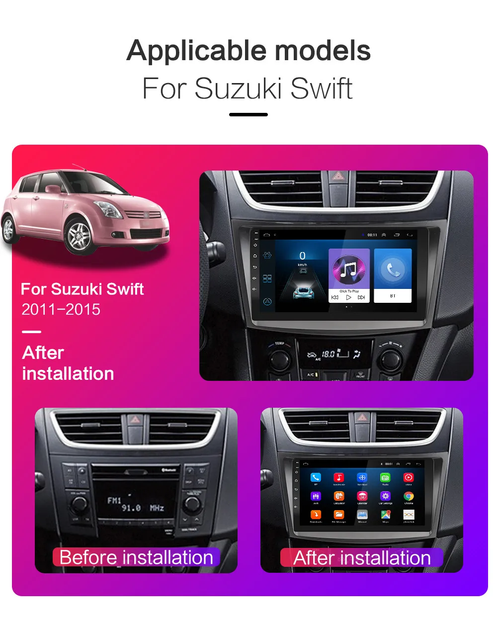 Для Suzuki Swift 2011 2013 2014 2015 1, 4-х ядерный конфигурация включает в себя (Оперативная память + Встроенная память): 1 Гб + 16 ГБ/2 ГБ + 16 ГБ/2G + 32G / 4G-SIM-3560-2G + 32G [дополнительно]; 2, 8-ядерный конфигурация включает в себя (Оперативная память + Встроенная память): 7260L-2G + 32G / 7260L-4G + 64G / 4G-SIM-5760-2G + 32G / 4G-SIM-5760-4G + 64G / 4G-SIM-TS10-4G + 64G/4g-sim-ts6g на выбор + 128 3, 4-х ядерный содержит: версия: Android 8,1; Четырехъядерный процессор MTK8227 / Cortex-A7 Поддержка автомобиля logo5; Sfactory пароль: 8888 Разрешение: HD 2.5D,1024*600; Не поддерживает функцию AM, функцию RDS; Обычная посылка WiFi поддерживает функцию видеовыхода; Версия 3560-4G-SIM-WiFi: версия: Android 6,0; Поддерживает DSP; Не поддерживает функцию видеовыхода; 4, 8-Core содержат: версия: Android 9,0 или Android 10; Восемь ядер: CPU Quad core и GPU Quad core соответственно; Поддержка автомобиля logo5;Sfactory пароль: 8888; Разрешение: HD 2.5D,1024*600; Версия 7260L-WIFI: поддерживает функции DSP, сплит-экрана; Не поддерживает видеовыход; 4G-SIM-5760-WIFI и 4G-SIM-TS10-WIFI версия: поддерживает функции DSP, Carplay, сплит-экрана, слота для sim-карты 4G; Не поддерживает видеовыход; 5. Операционная система Android может установить приложение Google Play store Skype Facebook youTube Twitter и т. Д.; 6. Поддержка: радиостанция, Bluetooth Вызов, Bluetooth музыка, управление рулевым колесом, встроенный WiFi, MP3, видео музыка (MPG, AVI), навигация, видеовыход, зеркальная связь, USB 4G LTE WIFI ключ и другие функции; Поддержка OBD (опционально) Поддержка DAB + (опционально)