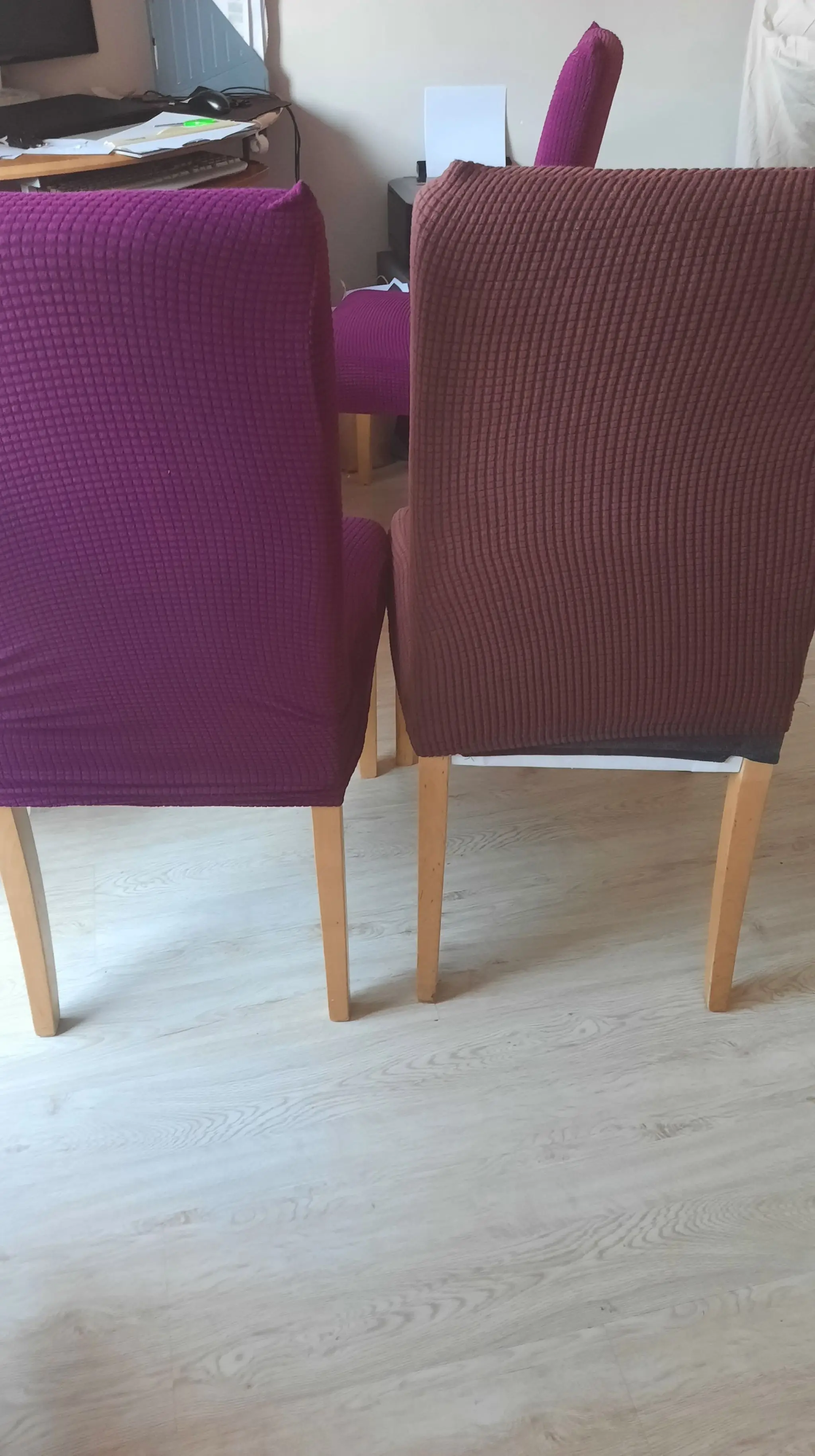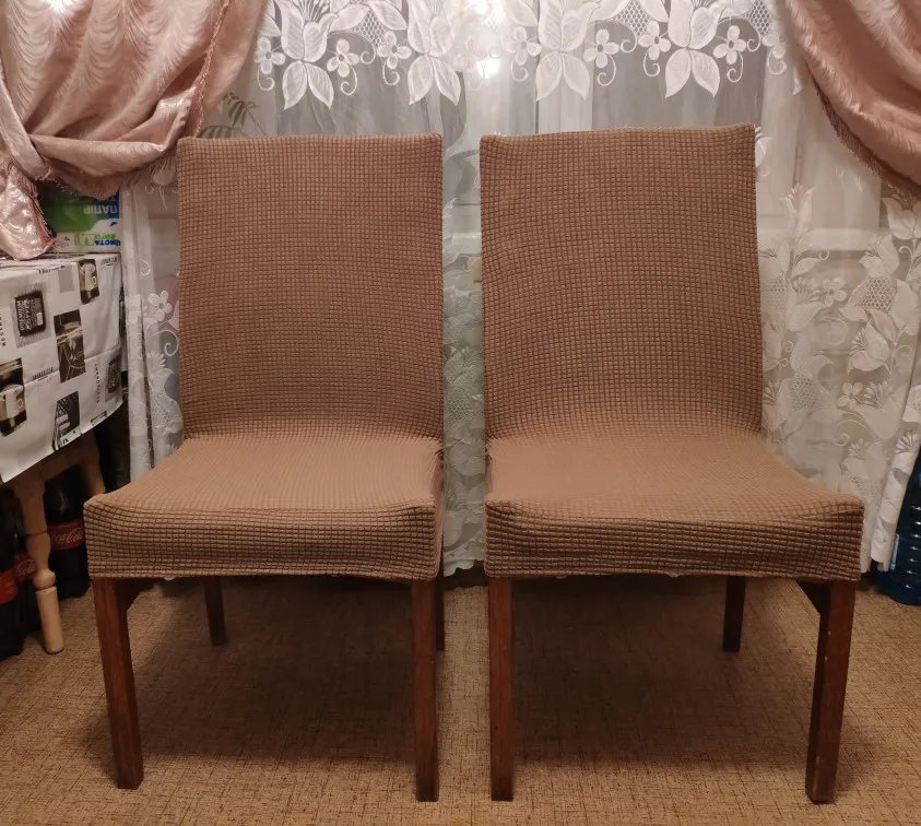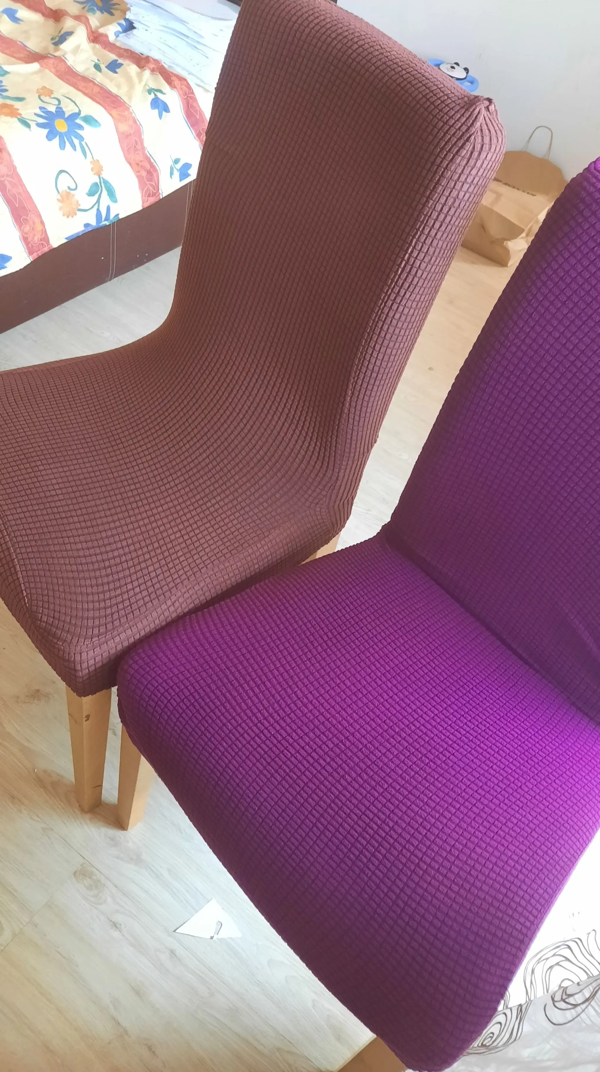 Размеры чехлов для стульев разных цветов не одинаковые-фиолетовые идеально подходят, но коричневый цвет был слишком мал. Продавец не ответил. Я писал несколько раз. Пришлось открыть спор, и он был решен как потеря для меня. Теперь у меня есть 4 бесполезные чехлы на стулья коричневого цвета :(
