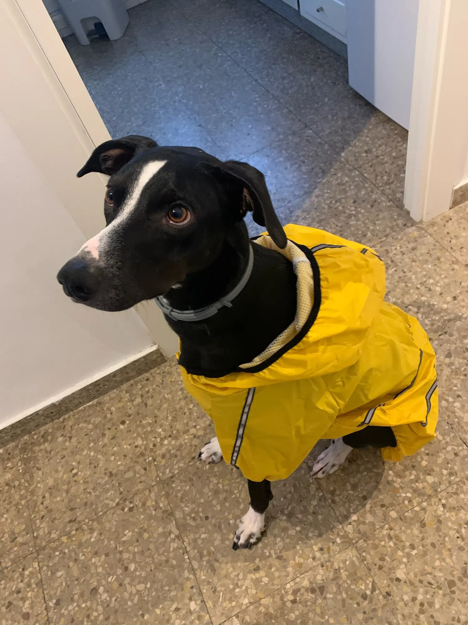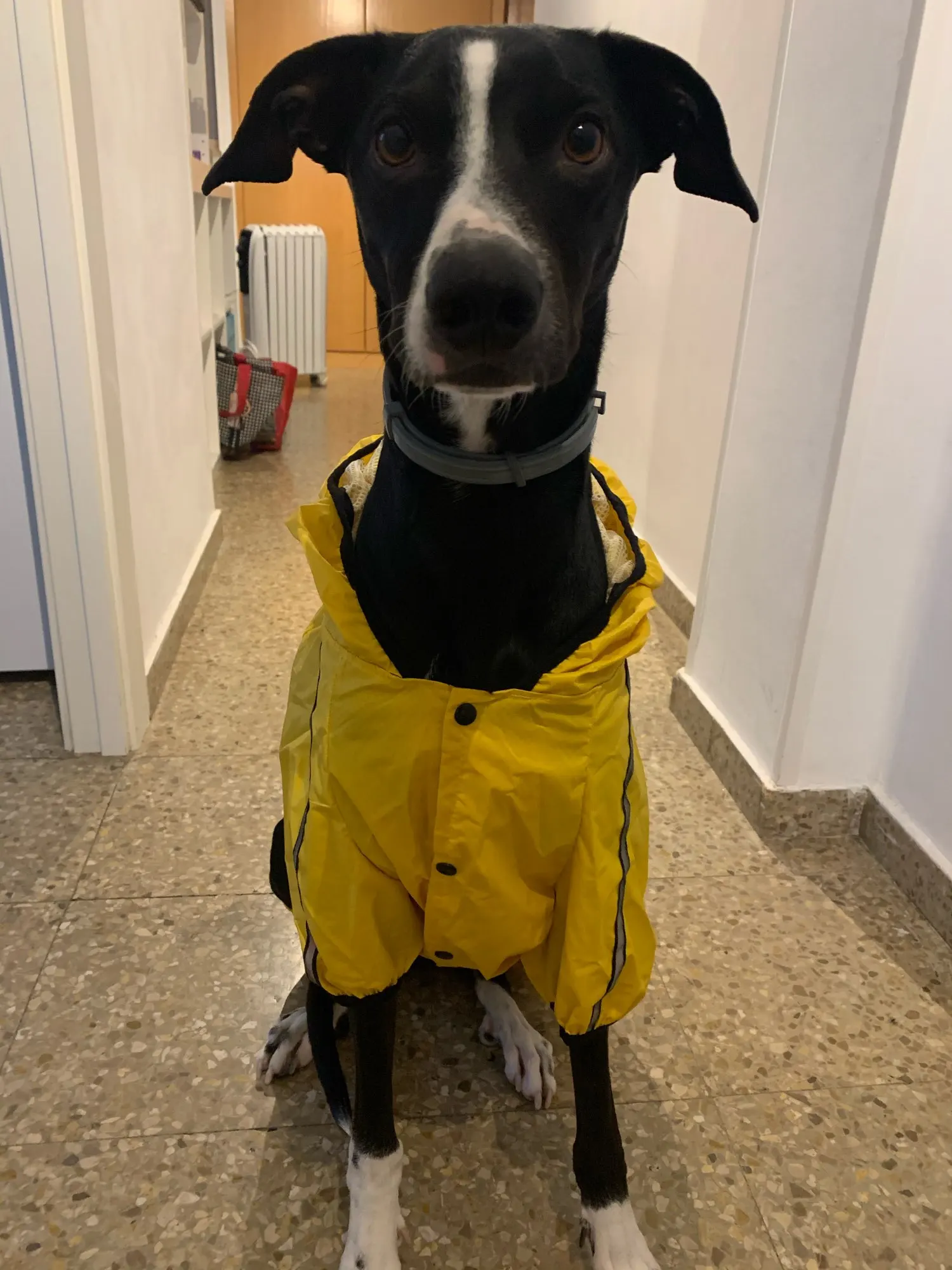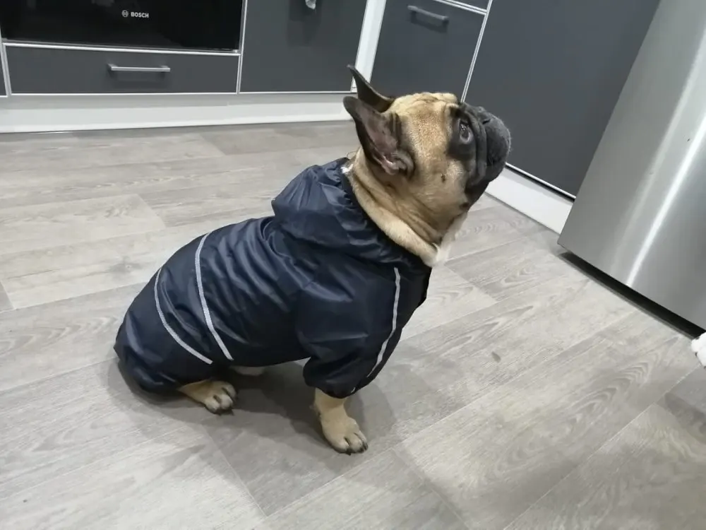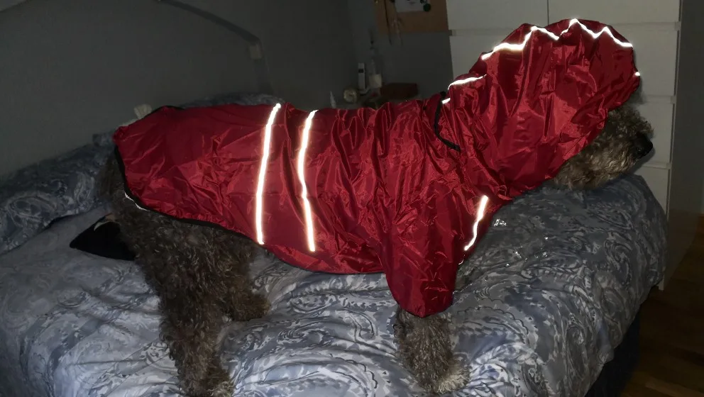 Моему апену очень понравился, а уж мне и того больше, теперь не придется моему пёсе под дождем мокнуть. Хорошо, что ориентируясь на табличные размеры, взяла на размер больше -3ХL, а иначе бы в груди был бы мал. (30 кг) Плащик мягкий, приятный, не шуршащий