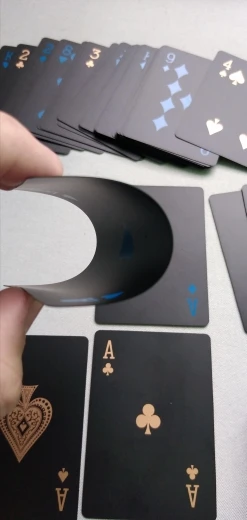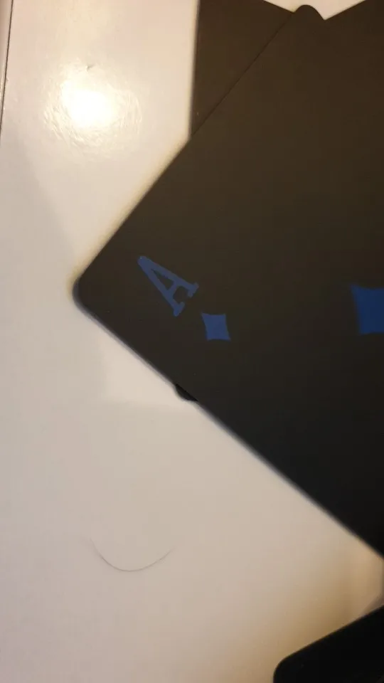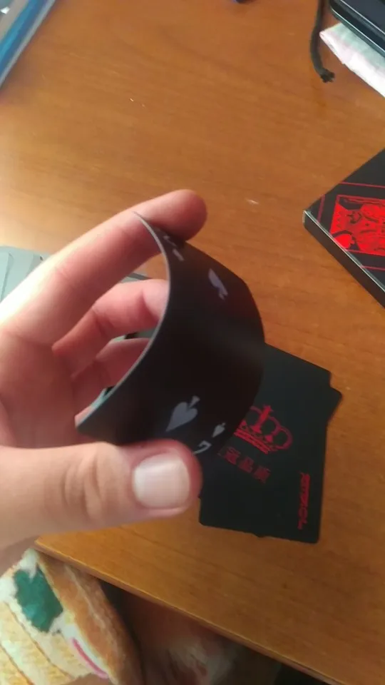 Толщина карт действительно тонкая, тоньше, чем бумага, они действительно сделаны из пластика, но настолько тонкие, что они могут быть сгибаются случайно, при затуманивании и имеют отметку изгиба, также вы не можете найти в описании, что карты не имеют какого-либо типа заднего хода только черный шаг, Для некоторых трюков может быть плюс.
