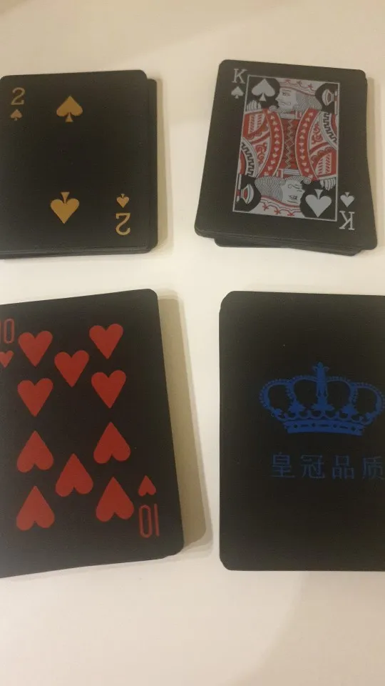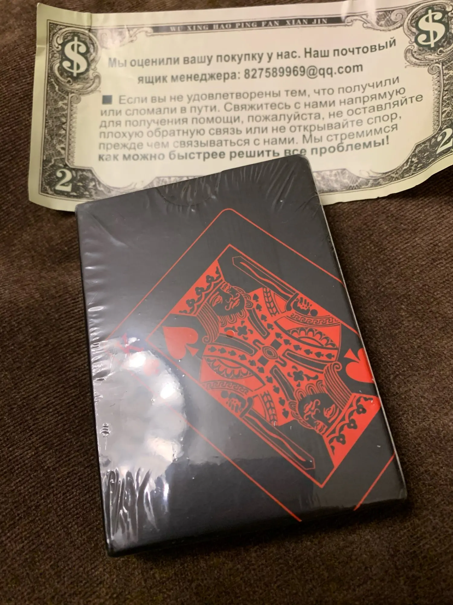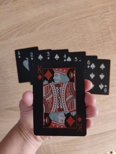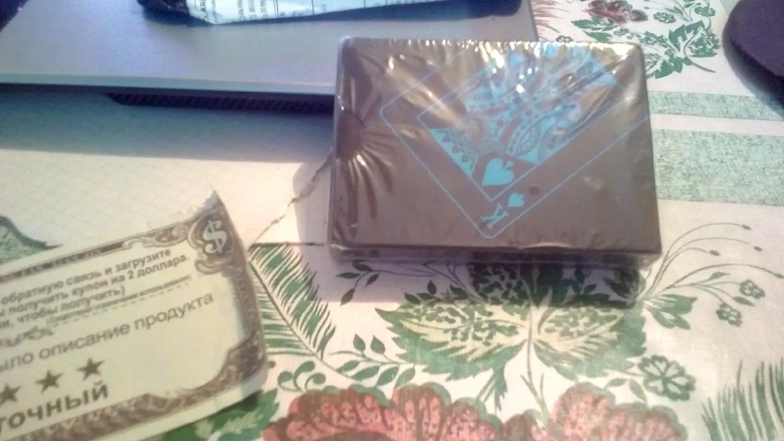 Карты хорошие, довольно качественные, хорошо держат форму при сгибании, но тонкие около 1мм, синий довольно сложно различим, но это терпимо. На купюре забыли в одном месте пробел вставить и "о" в слове очень, а так в целом неплохо написано) Карты довольно скользкие когда лежат друг на друге скатываются если неправильно положить, в руке лежат неплохо. На ощупь неплохие. Производитель явно любит масть пики, ибо туз в этой колоде данной масти выглядит самой красивой картой из всех, ну конечно после бьющей любую карту даже джокера, карты короны. В общем и целом карты мне понравились и упакованы они были прекрасно, в пупырку и пластиковую обложку, но даже в этом случае почта умудрилась помять упаковку карт, немного у края, в общем это талант к разрушению! В общем карты хорошие покупать рекомендую и еще рекомендую покупать не синие и красные, а оранжевые(вроде такие они там), короче не эти два цвета, оранжевые лучше всех(остальные темноваты и в полу-мраке вы их не увидите).