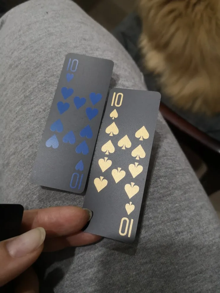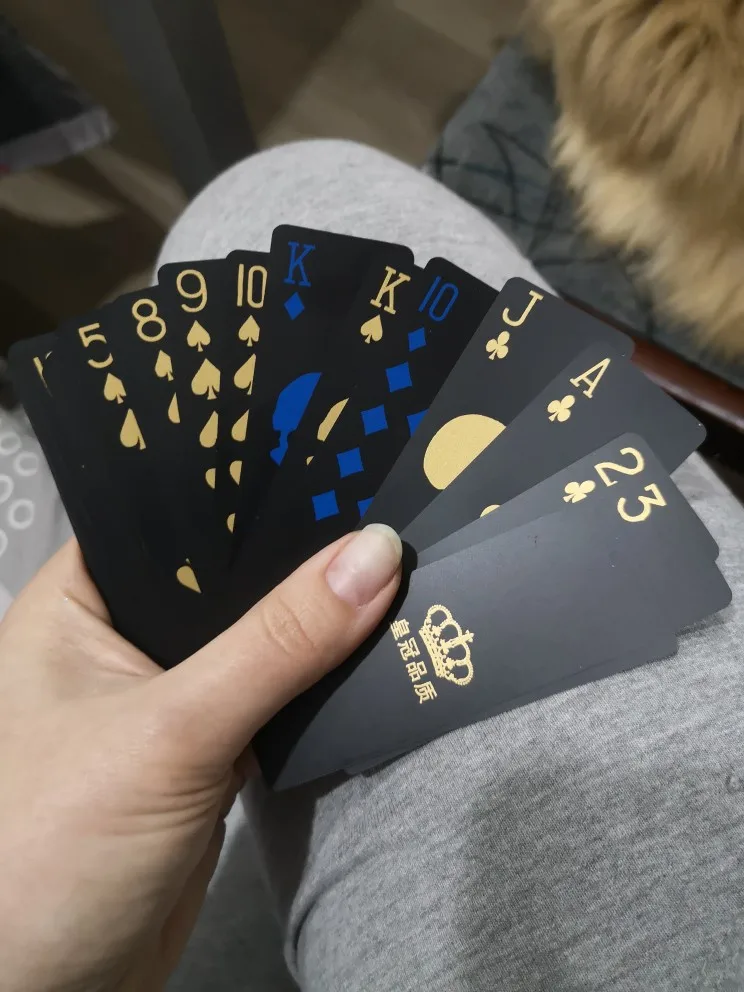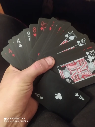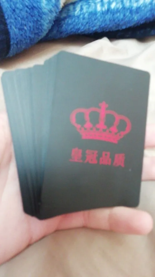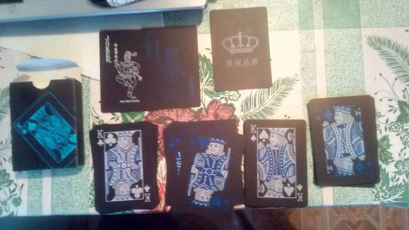Карты хорошие, довольно качественные, хорошо держат форму при сгибании, но тонкие около 1мм, синий довольно сложно различим, но это терпимо. На купюре забыли в одном месте пробел вставить и "о" в слове очень, а так в целом неплохо написано) Карты довольно скользкие когда лежат друг на друге скатываются если неправильно положить, в руке лежат неплохо. На ощупь неплохие. Производитель явно любит масть пики, ибо туз в этой колоде данной масти выглядит самой красивой картой из всех, ну конечно после бьющей любую карту даже джокера, карты короны. В общем и целом карты мне понравились и упакованы они были прекрасно, в пупырку и пластиковую обложку, но даже в этом случае почта умудрилась помять упаковку карт, немного у края, в общем это талант к разрушению! В общем карты хорошие покупать рекомендую и еще рекомендую покупать не синие и красные, а оранжевые(вроде такие они там), короче не эти два цвета, оранжевые лучше всех(остальные темноваты и в полу-мраке вы их не увидите).