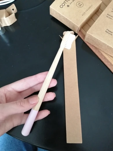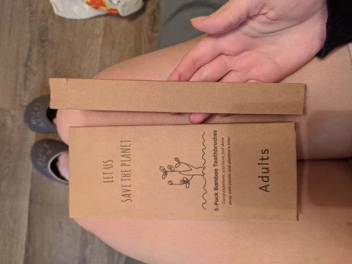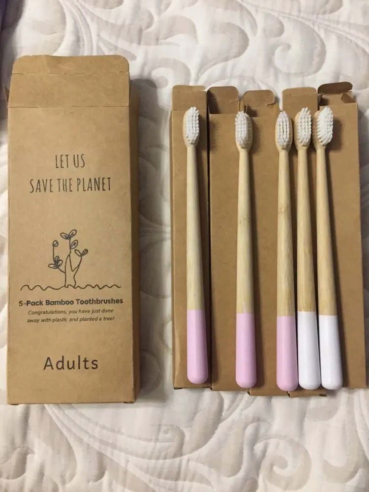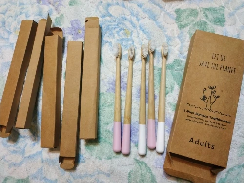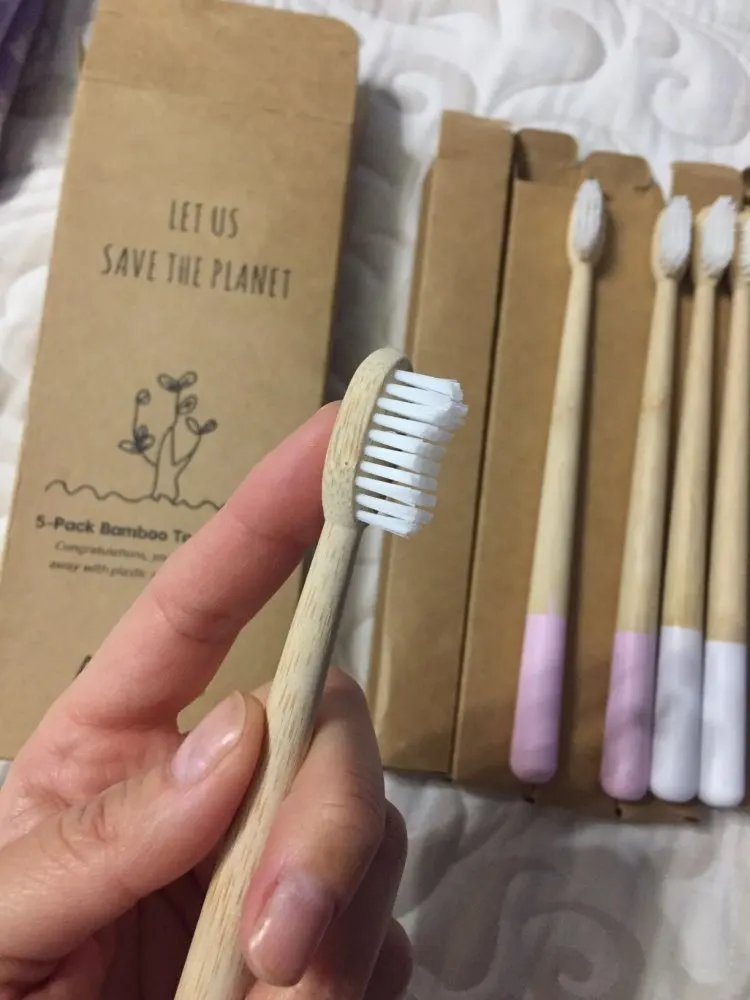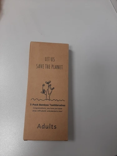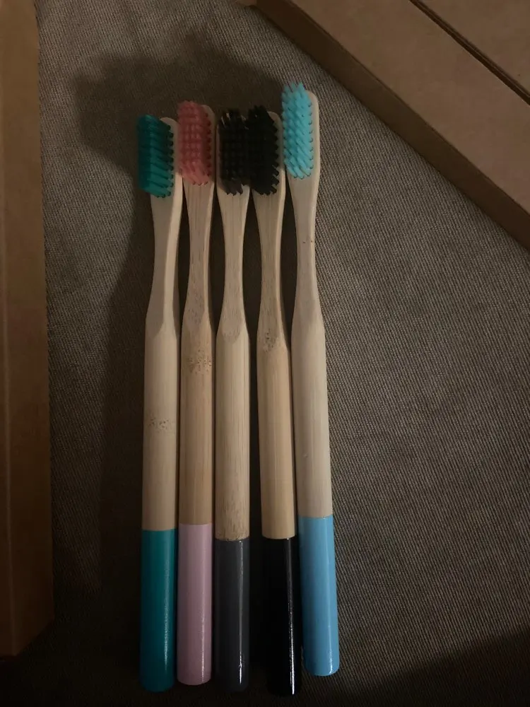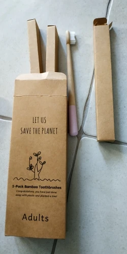 Доставка около трех недель. В коробке 5 щеток, упакованные каждая в индивидуальную коробочку. Материал - дерево, щетина- синтетическая. Жесткость щетины средняя. Нижняя часть ручки покрашена разноцветный краской. Щетина тоже разных цветов. Деревянная поверхность щеток отшлифована достаточно хорошо, но на мой взгляд не идеально, все таки рот, дёсны - слизистая чувствительная, и как то грубоваты эти щетки. Возможно, так кажется после использования пластиковых щеток. В общем, мне не очень комфортно чистить такой щеткой, но это лично мое ощущение, возможно кому то наоборот нравится. Оценку не снижаю, поскольку товар соответствует описанию. К тому же экологичная упаковка и материал:))