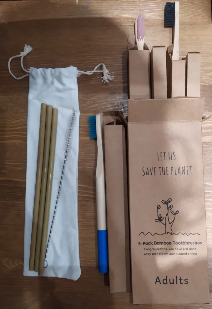 Взял многоразовые трубочки для коктейлей. Упакованы в тканевый мешочек, 3 трубочки из бамбука и ёрших для их чистки. На самом деле я думал что трубочки стеклянные или металлические - бамбуковые конечно тоже прослужат какое-то время, но явно не столько же, сколько аналоги из металла или стекла.