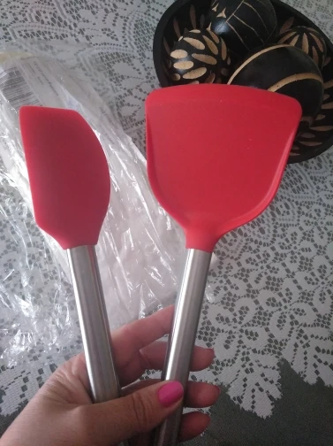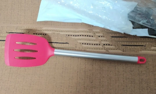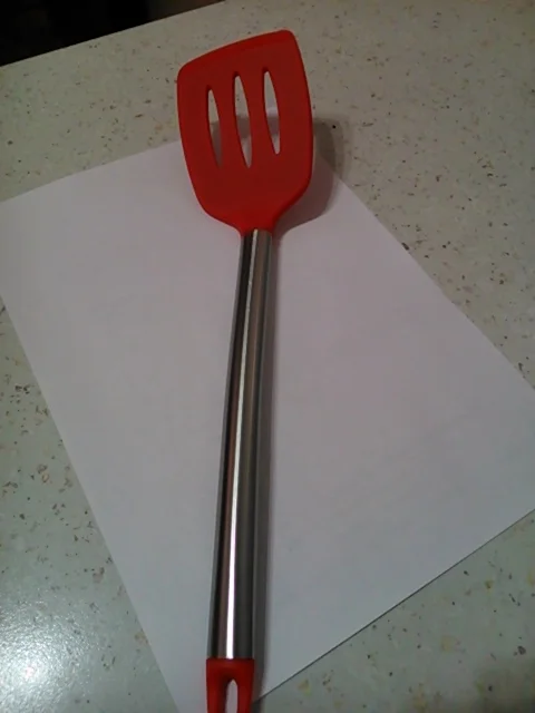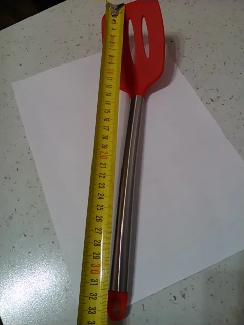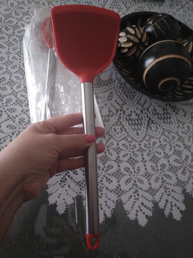 Дошла в Минск (Беларусь) за 44 дня. Лопатка длиной 33 см, ручка крепкая, крепление к ручке стойкое, не снимается, сама красная лопатка очень жесткая, наверное внутри пластиковый каркас. Силикон хороший, без запаха. Спасибо продавцу.