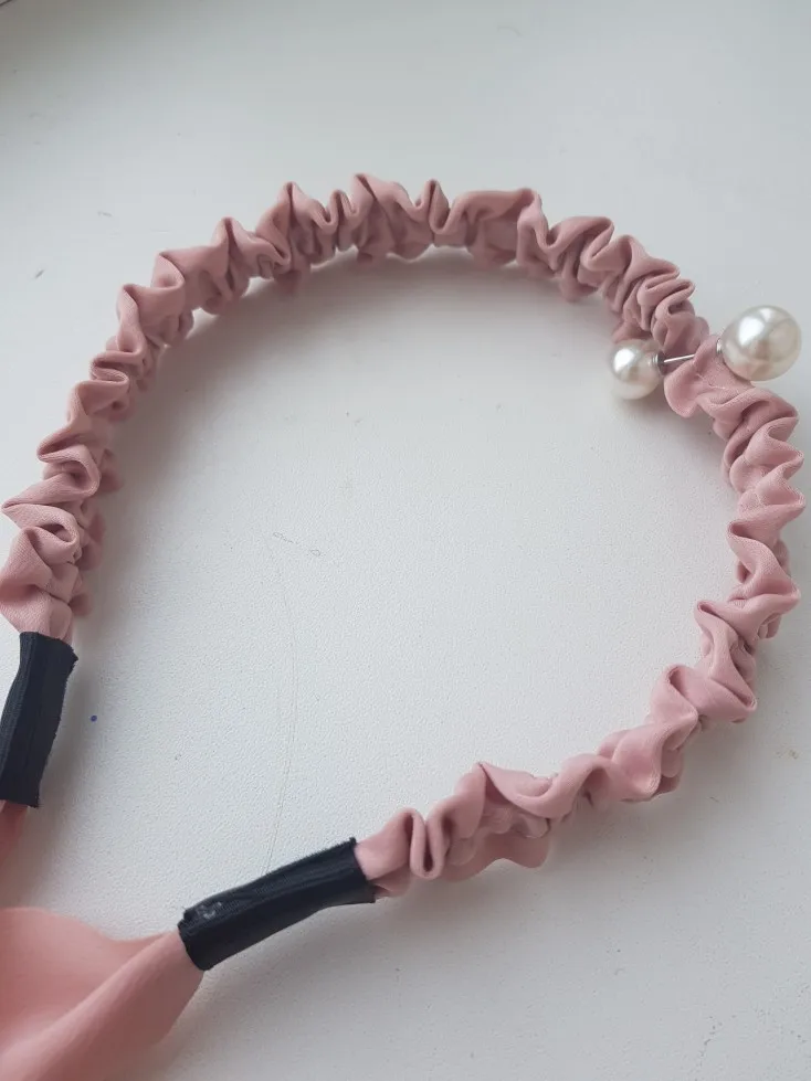 Необычный ободок, полностью соответствует картинке. Сделан очень аккуратно, на голову не давит. Материал на ощупь приятный. Цвет грязно-розовый. Длина лент около 46 см каждая. Дефектов нет. Доставка 26 дней. Магазин отличный, спасибо продавцу!