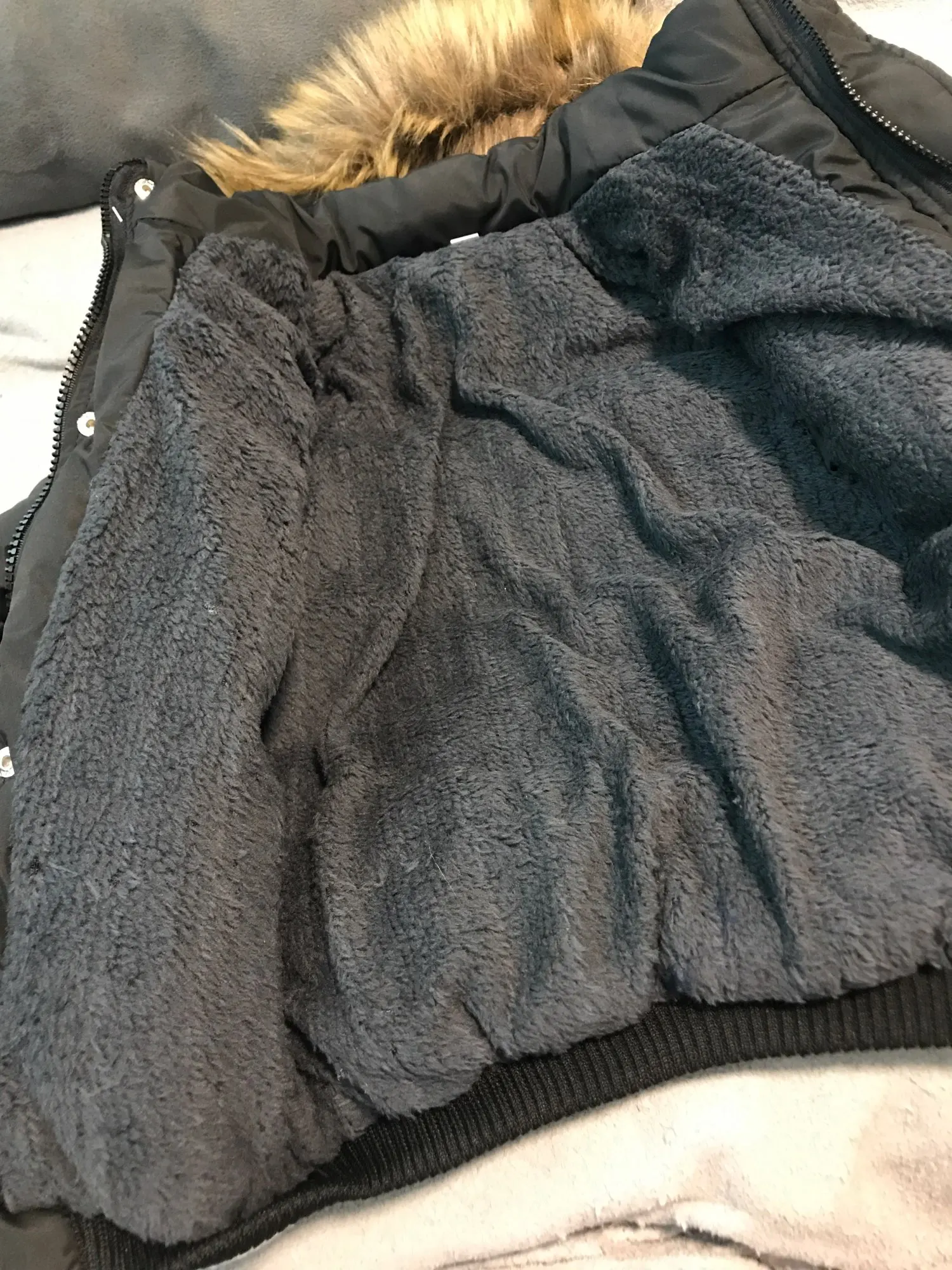 Как описано, темно-синий и коричневый мех вместо серого. Но очень теплый. Рукава не имеют подкладки, но очень толстые, так что рукава не холодно. Застежка-молния, которая хорошо работает. Это будет очень хороший год для школы. Спасибо продавцу