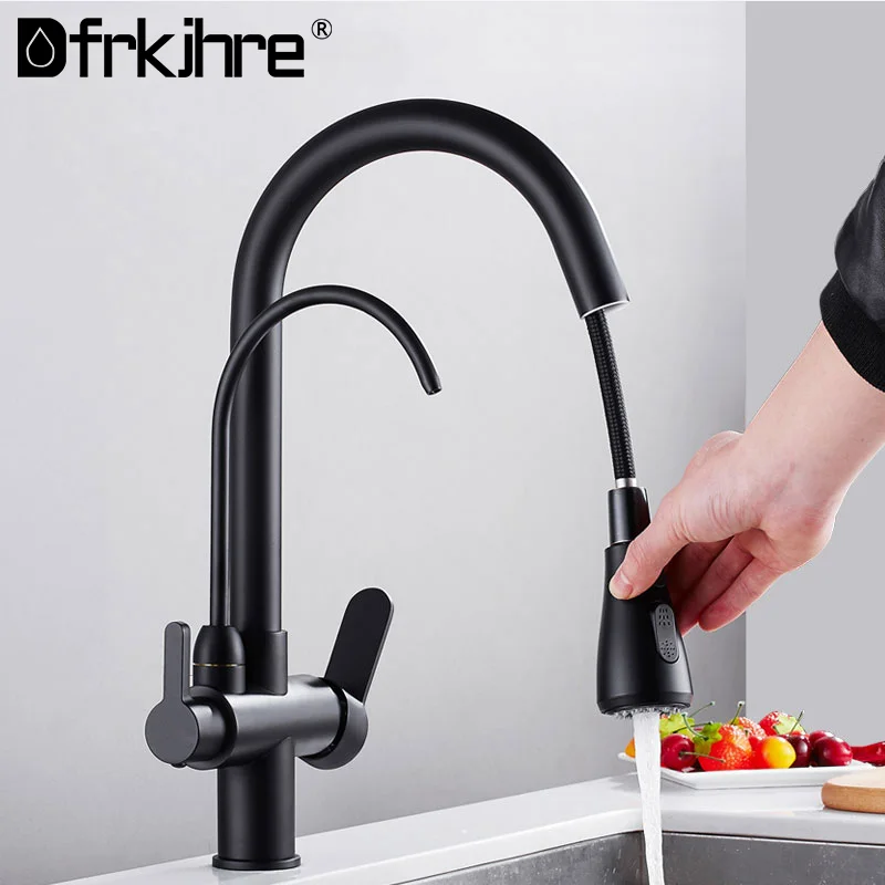 Смеситель для кухни Матовый Черный латунный с фильтром, выдвижной кран из чистой воды, вращающийся кран для горячей и холодной воды