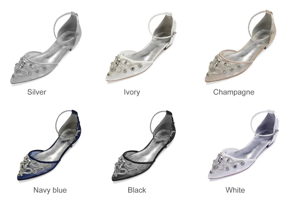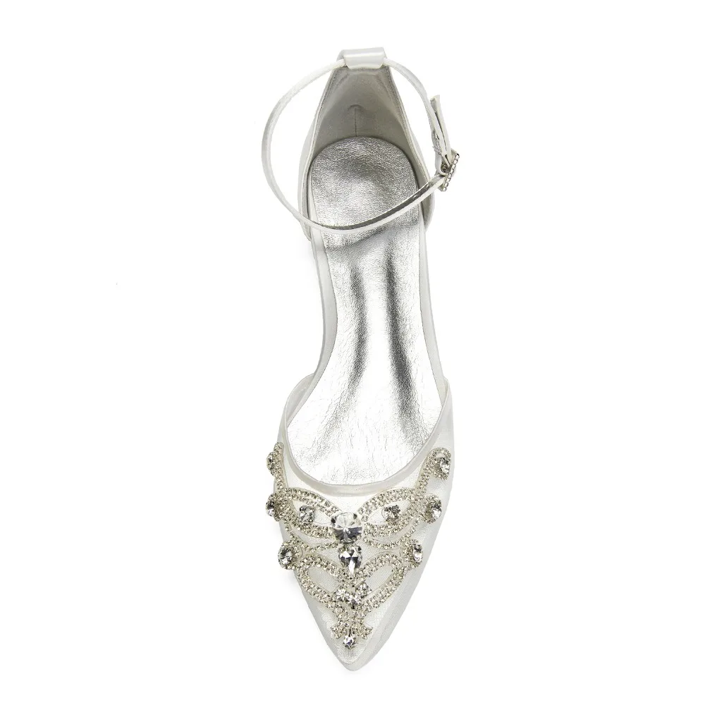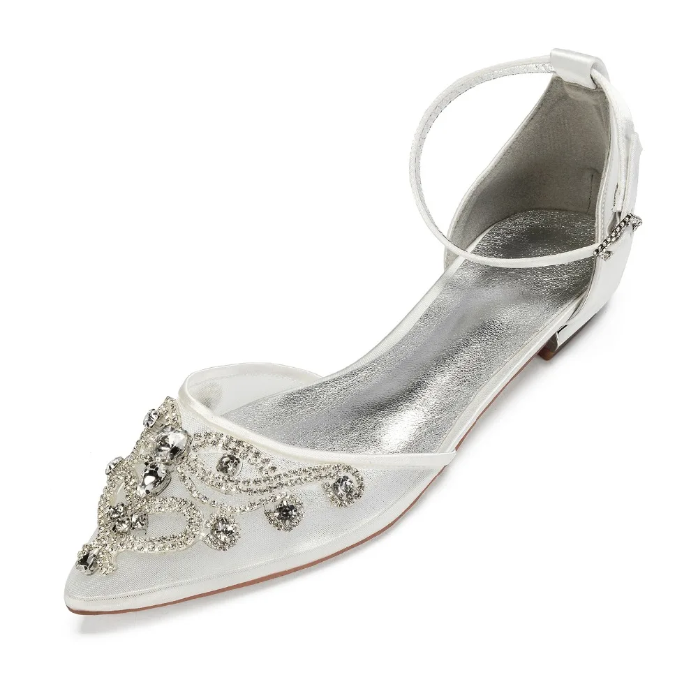 Элегантные свадебные туфли на плоской подошве с острым носком и ремешком на щиколотке, сетчатые атласные вечерние туфли с аппликацией и кристаллами на плоской подошве для танцев и вечеринок