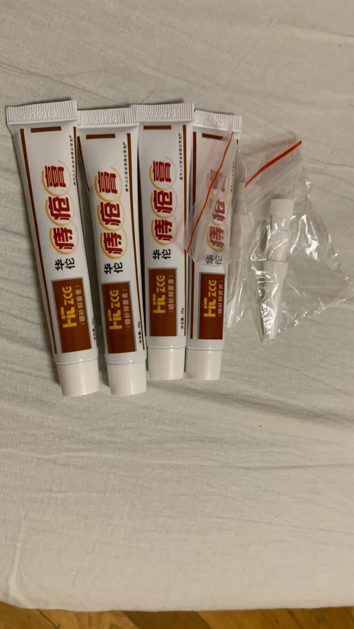 All according to description: 4 creams, 6 connectors. Fast delivery. Expiration date on tubes 20201201 I'd hope it just the date of birth. Additional review in a month or two, after testing on eyes (for black spot area) and direct, to hemorroid. Внешне выглядит точно, как в описании. 6 насадок, 4 тюбика, без наёба в этом плане. Доставка сверхбыстрая (возможно взял на три копейки дороже, чем дефолтная от продавца. всегда советую сравнивать если не хочется ждать 3 месяца покупку). Беру первый раз, отзыв использования будет месяца через два. Брал по отзывам на пробу. На каждом дата 20201201 - не то производства, не то срок годности. Всё на китайском.