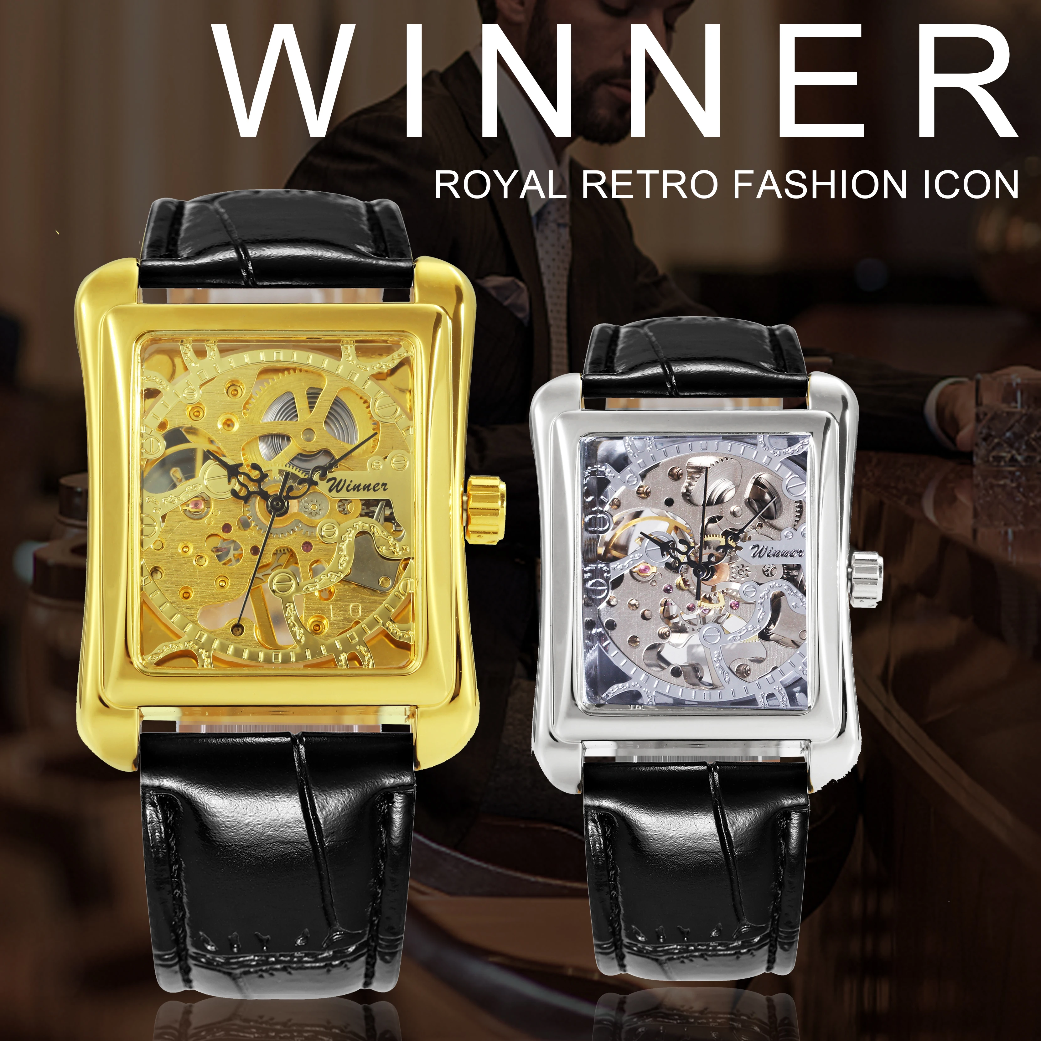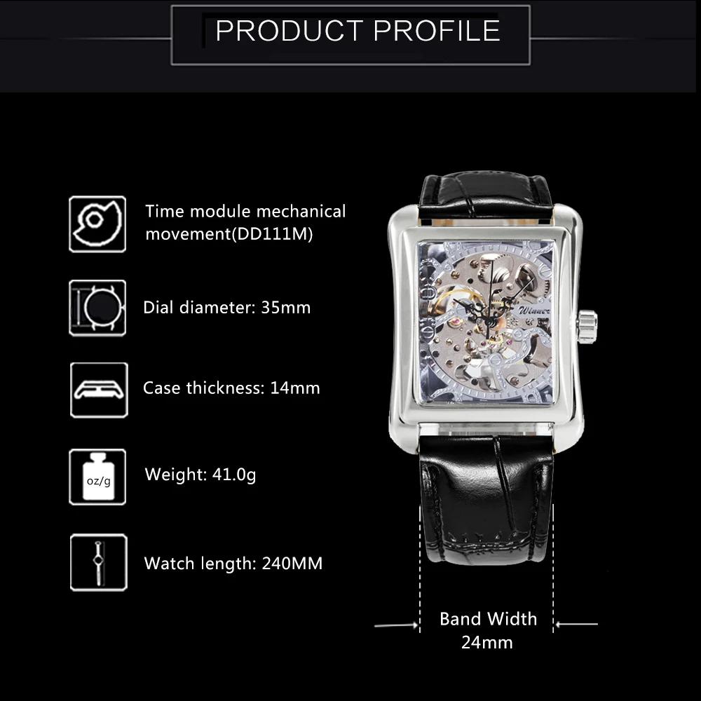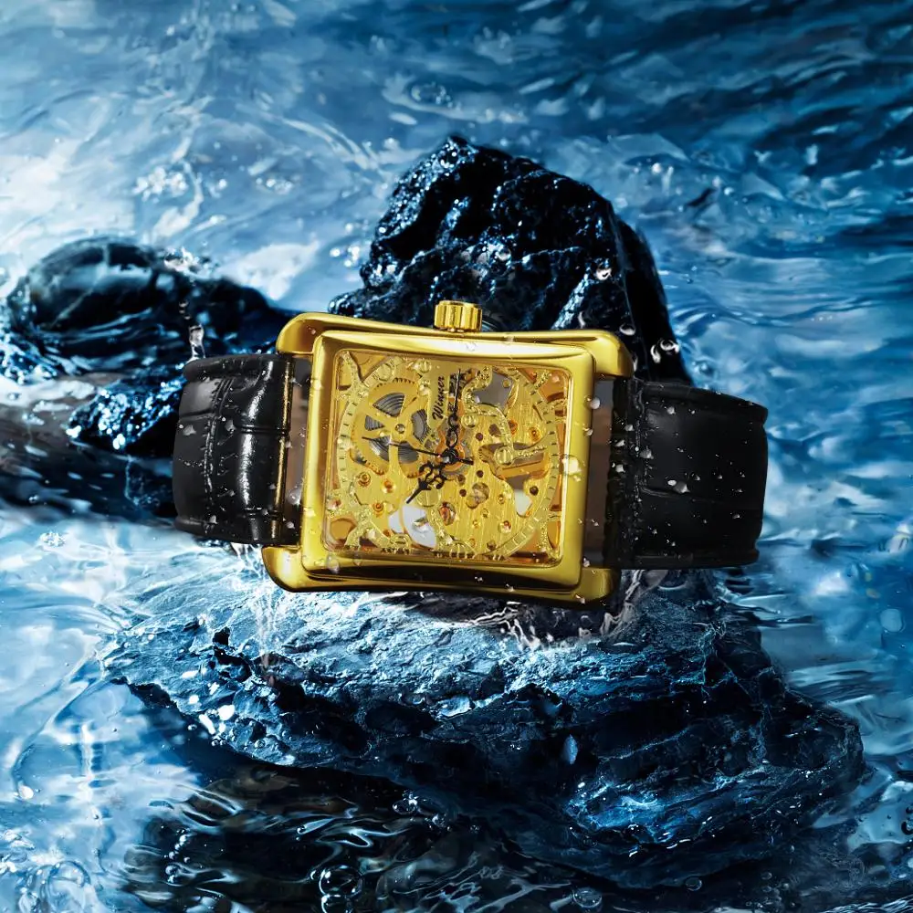 Механические часы WINNER, скелетоны, наручные часы с кожаным ремешком, квадратные, тонкие, унисекс