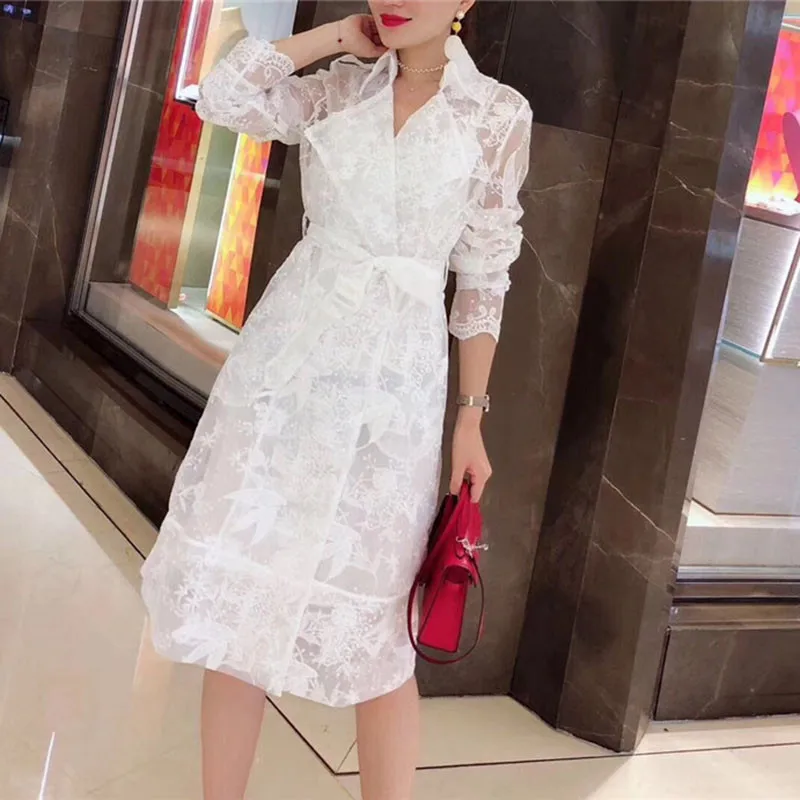 Женская ветровка с длинным поясом, Корейская версия, весенне-осеннее белое пальто на бретельках, комплект из двух предметов, модное кружевное пальто для женщин