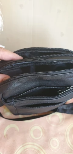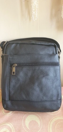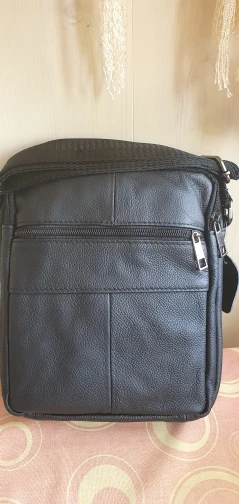 сумка немного больше, чем я ожидал, но хоть на ремне не сэкономили, кожа слегка пованивает, перегородка между отделениями в одном месте из жёсткого кожзама