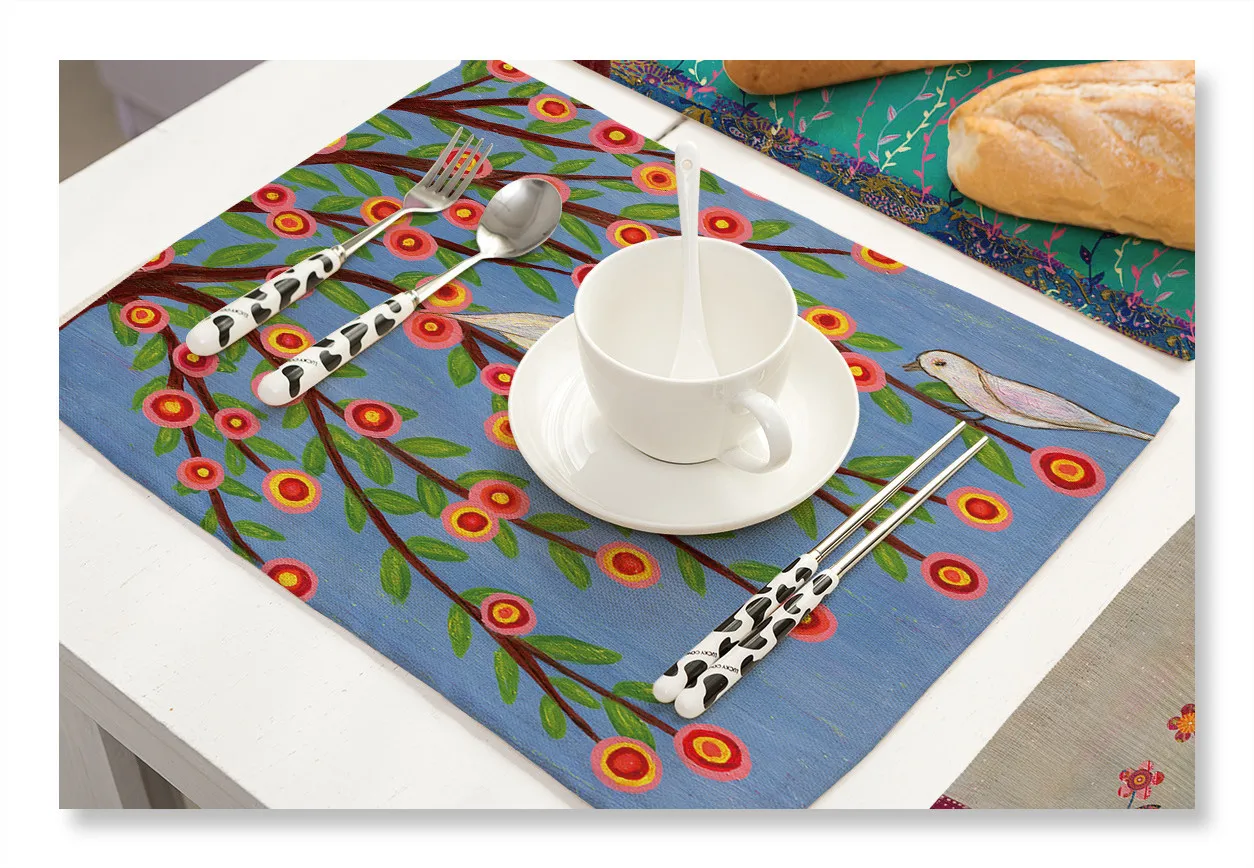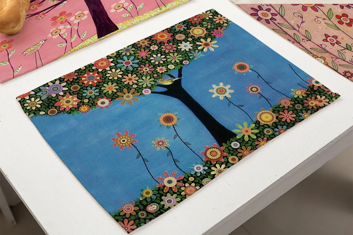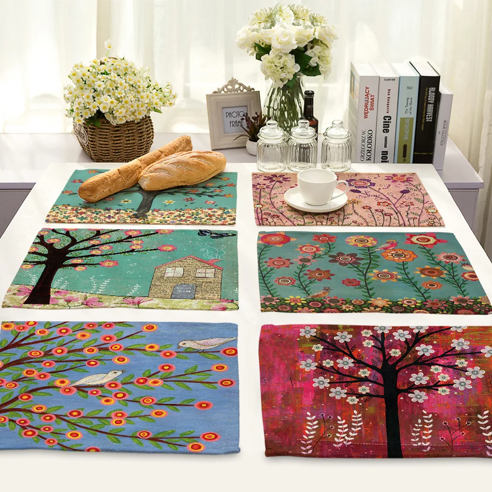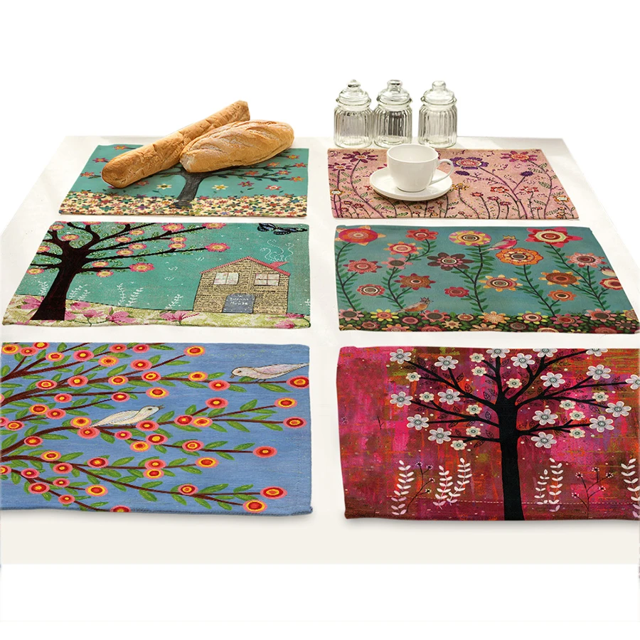 Мультяшное Дерево жизни птица цветок дизайн кухонные подставки для обеденного стола Ткань Льняная прямоугольная аксессуары чашка