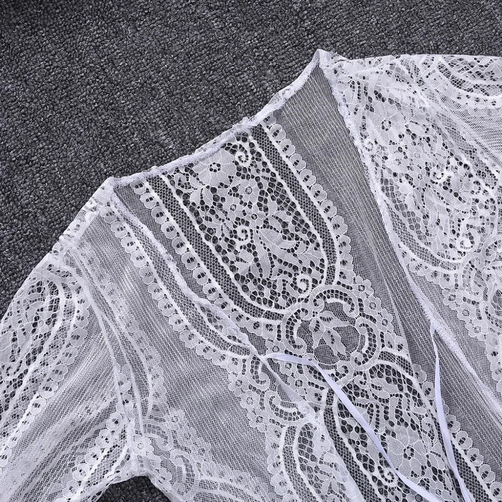 Длинные расклешенные рукава с разрезом, Открытый спереди кардиган, Макси длина в пол, приталенный крой, сплошной цвет, сексуальное прозрачное полное цветочное кружево.