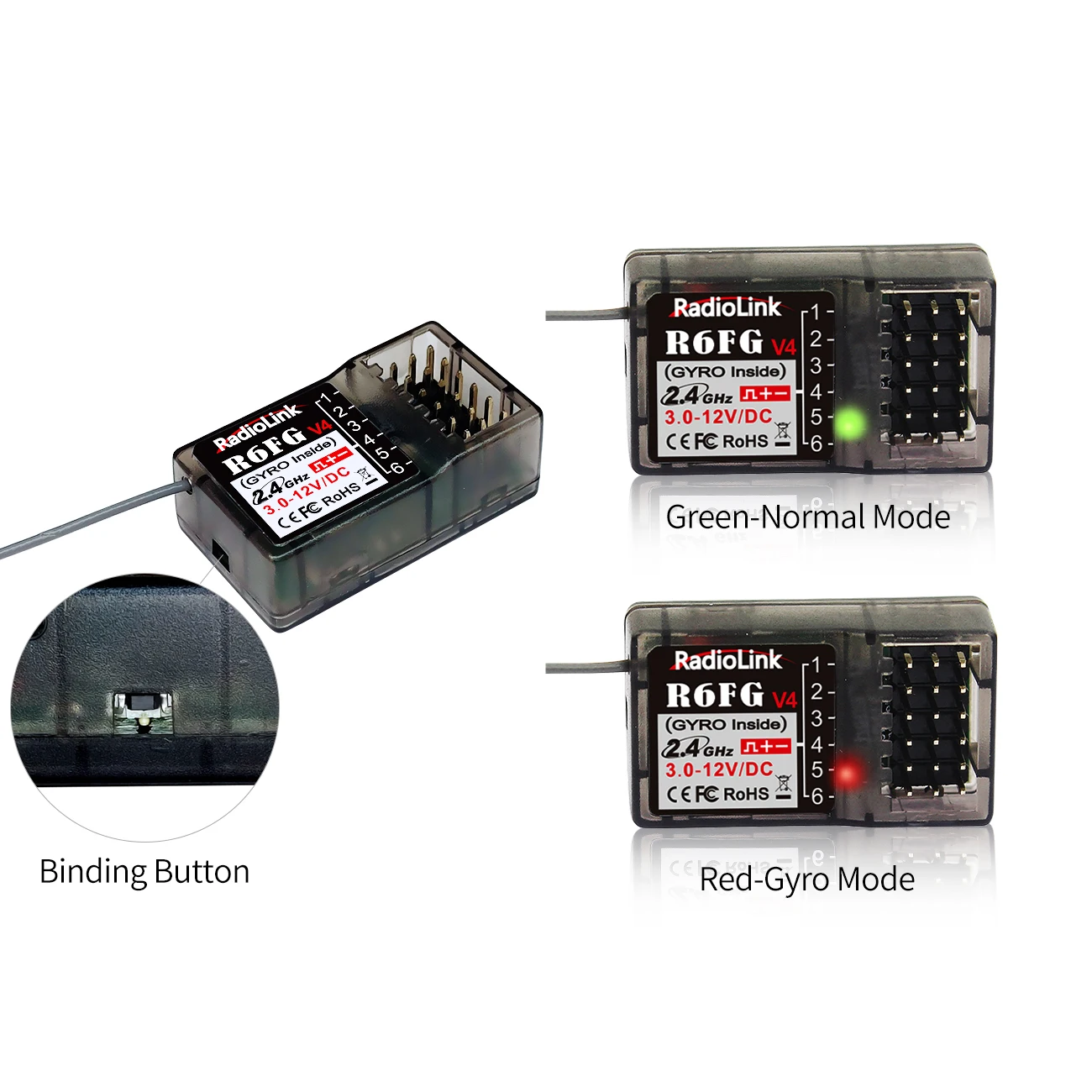 Внимание:Приемник с гироскопом (R7FG,R6FG,R4FGM) по умолчанию не включал функцию гироскопа. Убедитесь, что R7FG не двигается при включении, потому что R7FG будет выполнять самопроверку. Светодиодный индикатор R7FG с двумя индикаторами, зеленый светодиодный индикатор показывает нормальный режим работы, а светодиодный индикатор-зеленый и красный-показывает режим работы функции гироскопа.