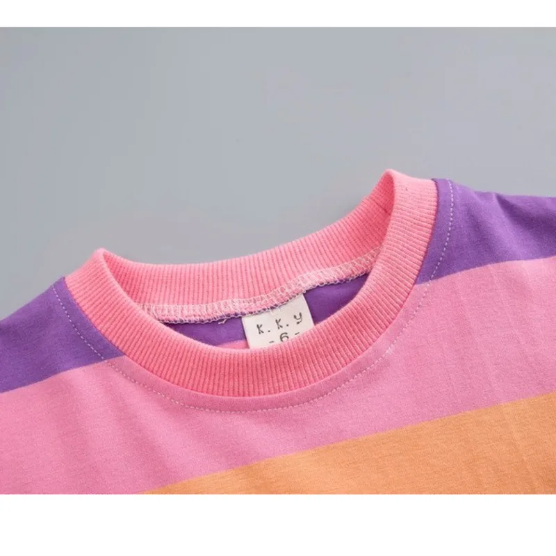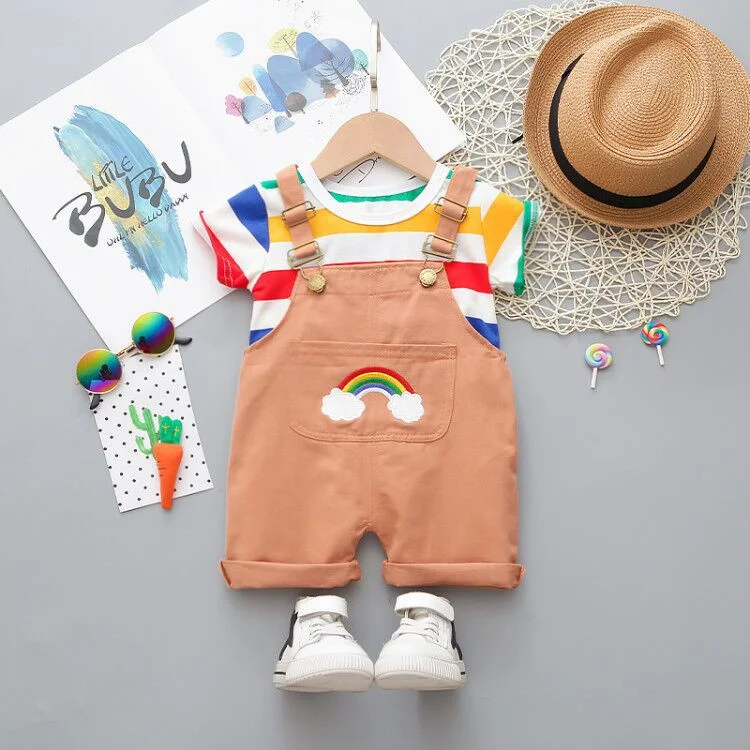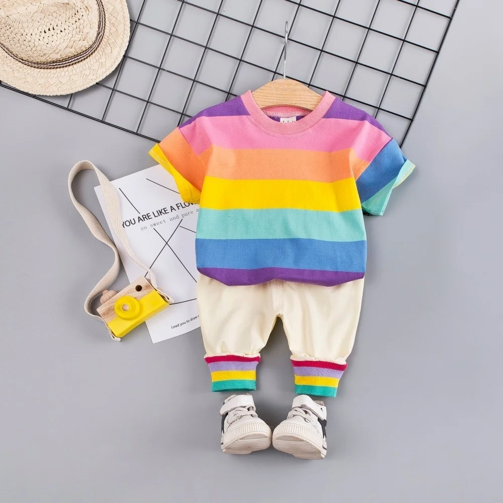 Комплект летней одежды из 2 предметов для маленьких мальчиков и девочек, хлопковая Радужная футболка, шорты на бретельках, Детский костюм