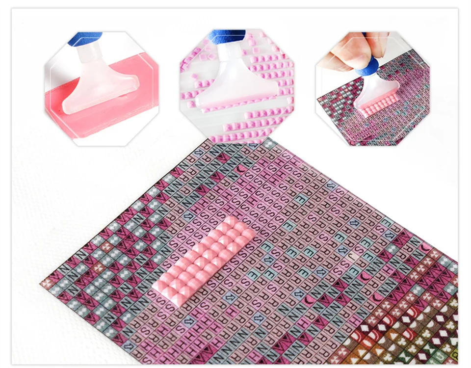Инструменты включают в себя: алмазную пластину, клей, пинцет, ручки (наклеить 10 бриллиантов одновременно)